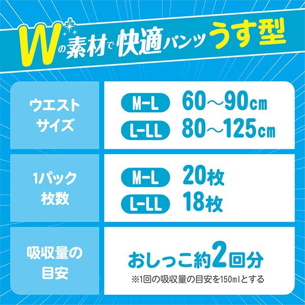 | 日本製紙クレシア アクティ 大人用 紙おむつ Wの素材で快適パンツ うす型 2回分吸収 M-L:20枚/L-LL:18枚 89067/89069 |