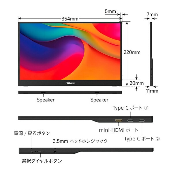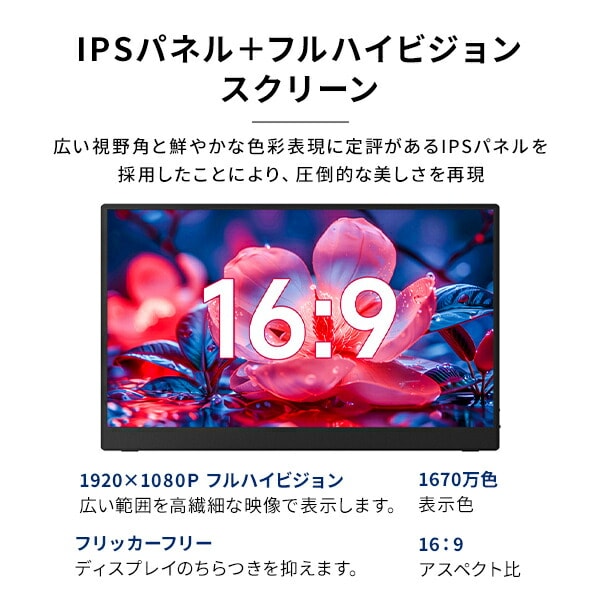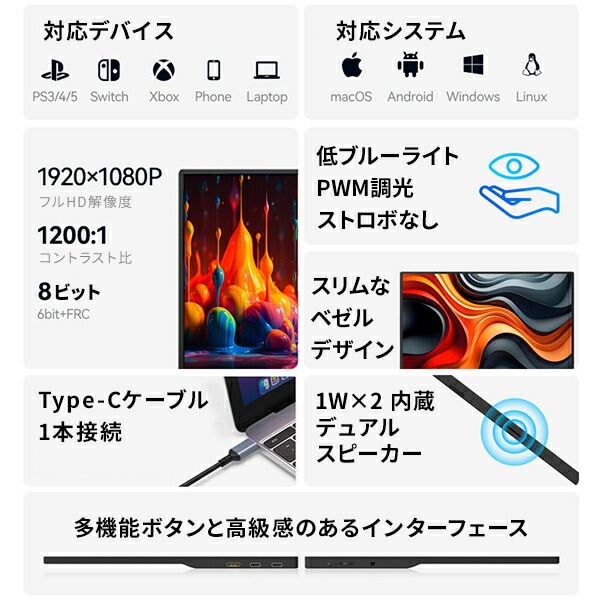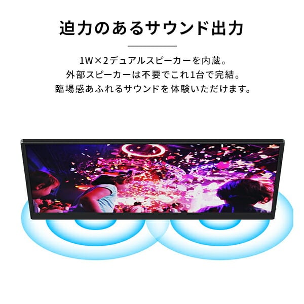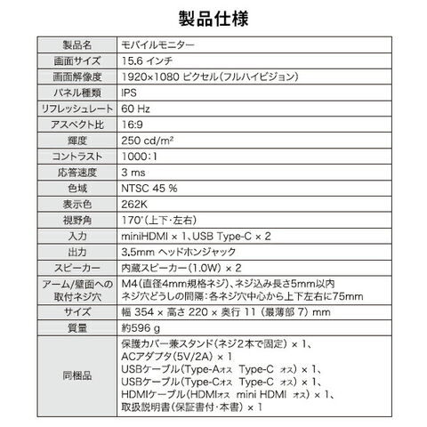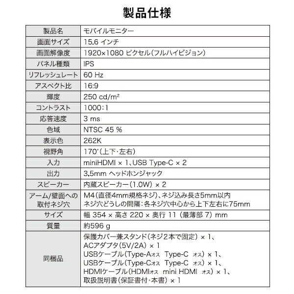 | 商品説明 | ●画面サイズ:15.6インチ ●画面解像度:1920×1080 Full HD ●液晶パネル:IPS ●リフレッシュレート:60Hz ●アスペクト比:(16:9) ●輝度:250cd/m2 ●コントラスト:(1000:1) ●応答速度:3ms ●色域sRGB:66% ●表示色:262K ●視野角:170°(上下/左右) ●入力:miniHDMI ×1 、USB Type-C×2 ●出力:3.5mmヘッドホンジャック ●スピーカー:内蔵スピーカー1.0W×2 ●付属品:保護カバー兼スタンド×1、ACアダプタ(5V/2A)×1、USBケーブル(Type-Aオス-Type-Cオス)×1、USBケーブル(Type-Cオス-Type-Cオス)×1、HDMIケーブル(HDMIオス-mini HDMIオス)×1、取扱説明書兼保証書 ●メーカー保証:1年間 |