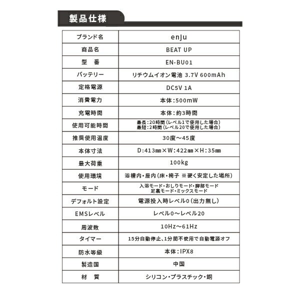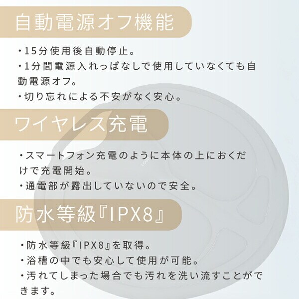 | 商品説明 | ●業務用美容機器製造のプロが開発した座るだけの簡単トレーニングマシン ●EMSの力で筋肉を刺激 ●効率よくトレーニングできる4つのモード(入浴/おしり/足裏/脚部) ●IPX8の防水性能で入浴中にも使える ●切り忘れを防ぐ自動電源オフ機能搭載 ●手元で安心して操作できるリモコン付属 ●ワイヤレス充電対応 ●バッテリー:リチウムイオン電池 3.7V 600mAh ●定格電源:DC5V 1A ●消費電力:500mW ●定格時間:15分 ●コードの長さ:約1.5m ●充電時間:約3時間 ●使用可能時間:2時間~20時間 ●推奨使用温度:30度~45度 ●最大荷重:100kg ●使用環境:浴槽内・屋内 ●防水等級:IPX8 ●EMSレベル:20段階 ●周波数:10Hz~61Hz ●付属品:ACアダプター、充電パッド、USBケーブル、リモコン、防水ジッパーバッグ(リモコン用)、乾燥用ネット、取扱説明書 ●メーカー保証1年間 |