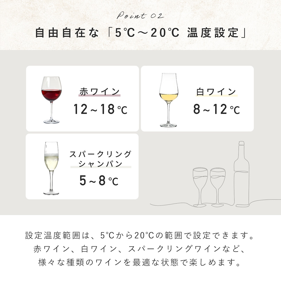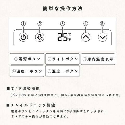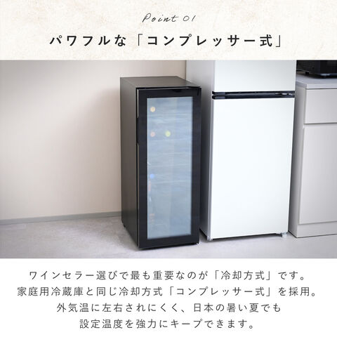 | 商品説明 | ●電源:AC100V(50/60Hz) ●温度範囲:5度-20度 ●収納本数:24本(5棚) ●定格内容量:60L ●冷却方式:コンプレッサー式 ●各棚の最大耐荷重:25kg ●チャイルドロック機能搭載 ●長期熟成に最適な12-15度を常にキープ出来る温度設定 ●猛暑でもハイパワー冷却で設定温度を維持できるコンプレッサー式 ●憧れのワインライフを今すぐ開始 ●設置場所を選ばないスリム設計 ●メーカー保証:1年 ※設置場所について、ワインクーラー側面は5cm、後ろ側は10cm、上部は10cm以上離して設置してください。 |