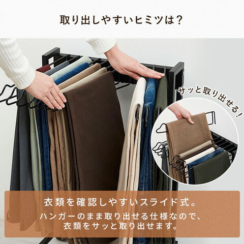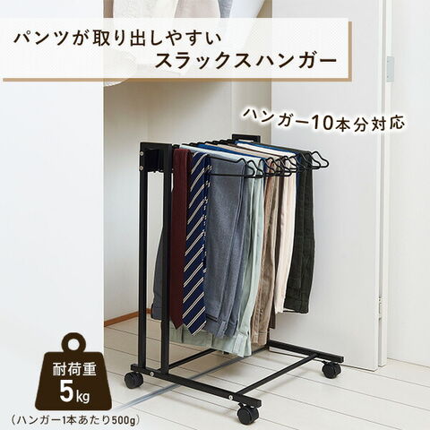 | 商品説明 | ●ズボンやスカートを取り出しやすくまとめて収納 ●ハンガーごと外せるのでサッと取り出しやすい ●スイング式で取りたい衣類が選びやすい ●耐荷重5kg(ハンガー1本あたり500g) ●ハンガー10本付き ●組立用工具付き |