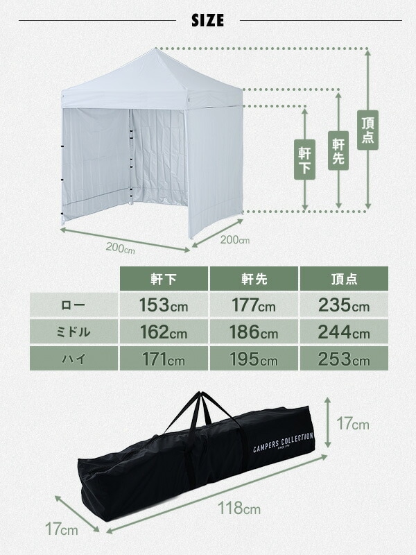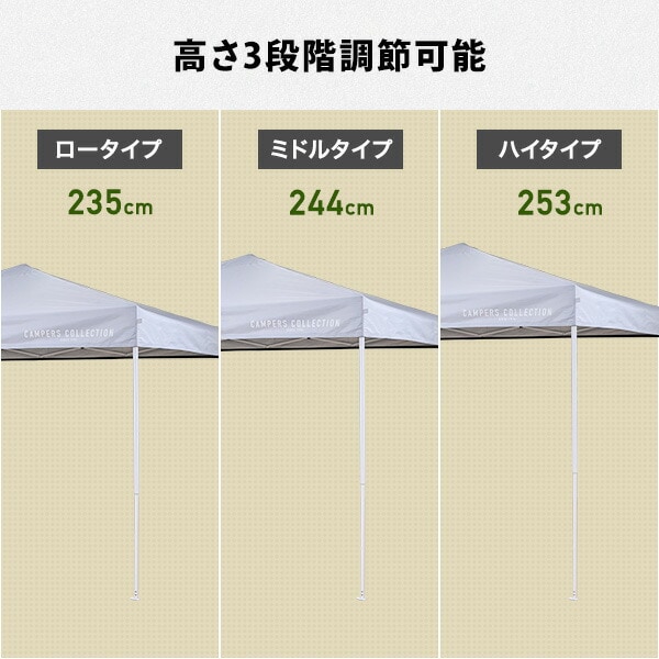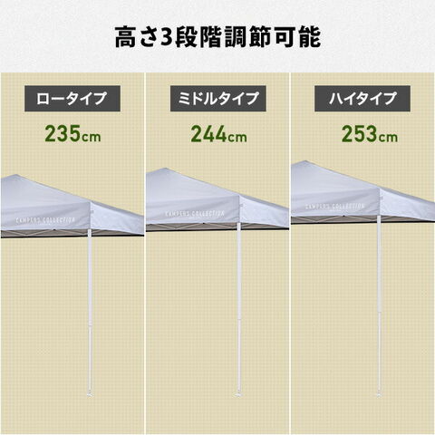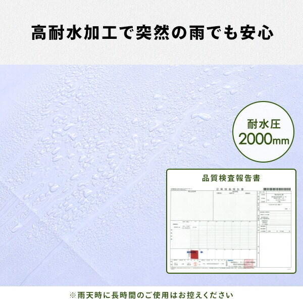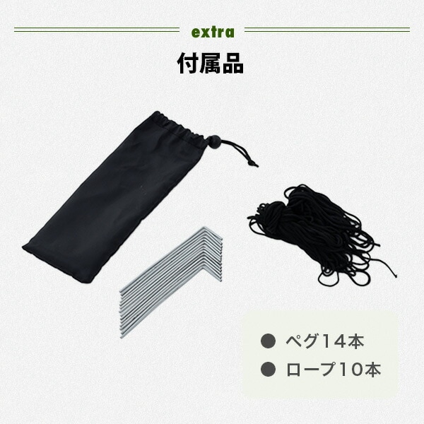 | 商品説明 | ●折りたたみ時サイズ:幅17×奥行17×高さ118cm ●サイドシート3枚付き ●フレームは丈夫なスチール製 ●耐水圧2000mm ●高さ3段階調節可能(頂点部235cm/244cm/253cm) ●組み立ては広げるだけの簡単設置 ●コンパクトに収納可能 ●UPF50+加工のシルバーコーティング生地採用 ●UV遮蔽率98.3%の優れたUVカット ●付属品:ロープ10本、ペグ14本 |