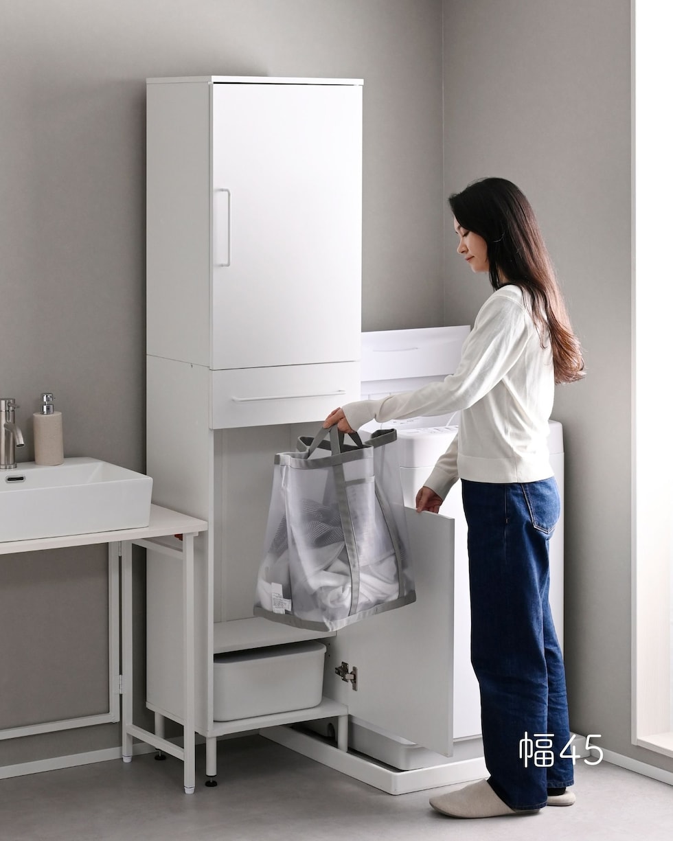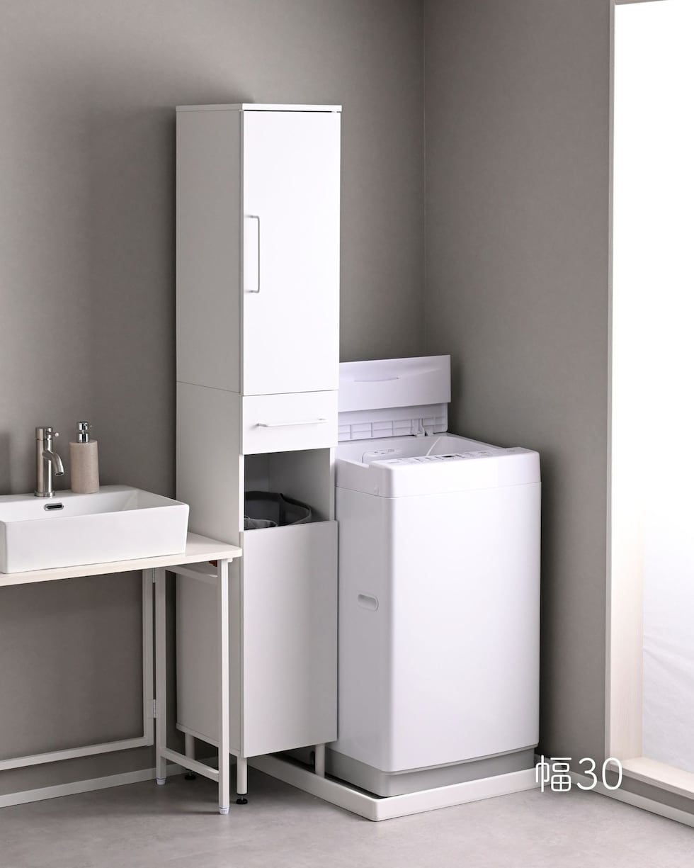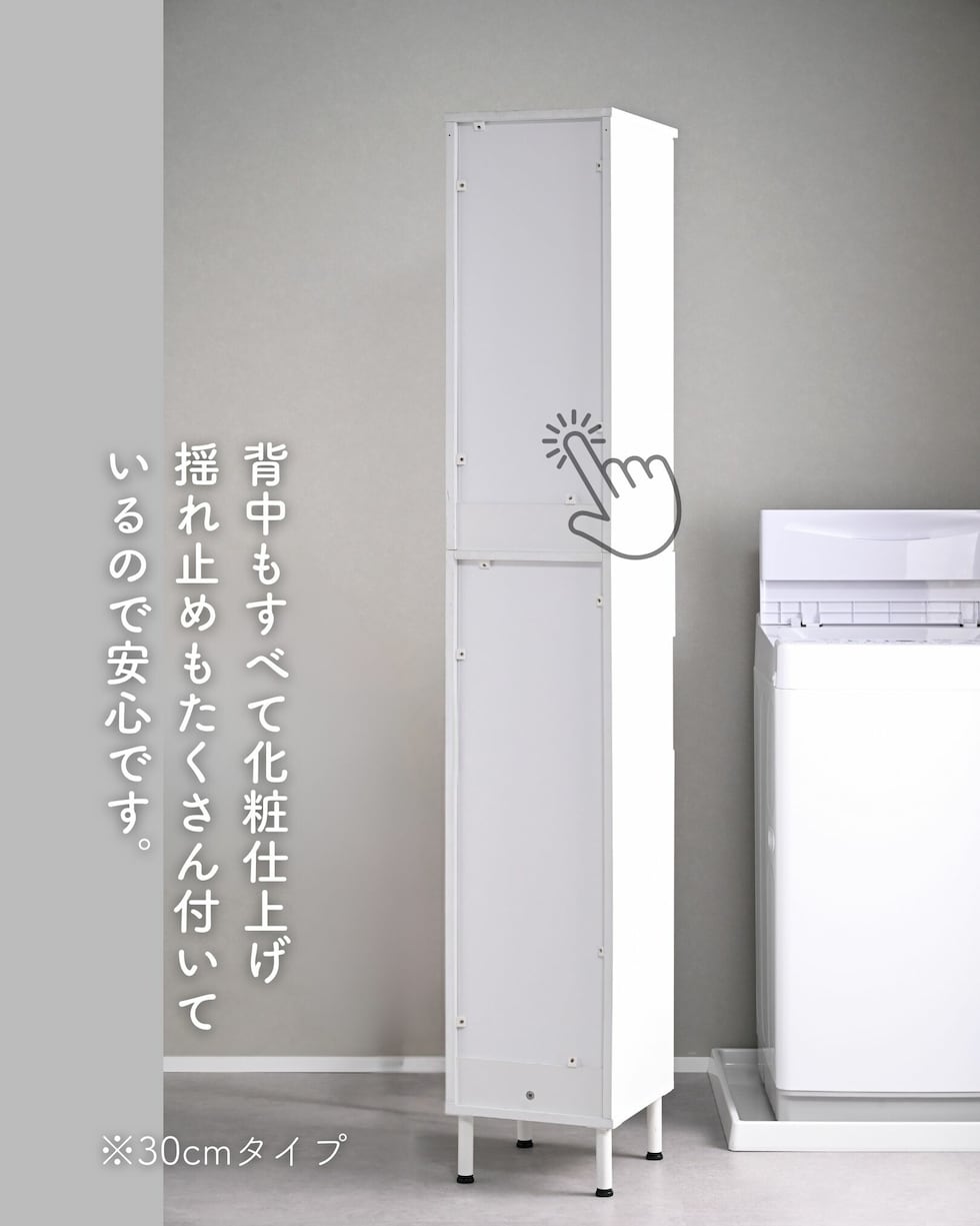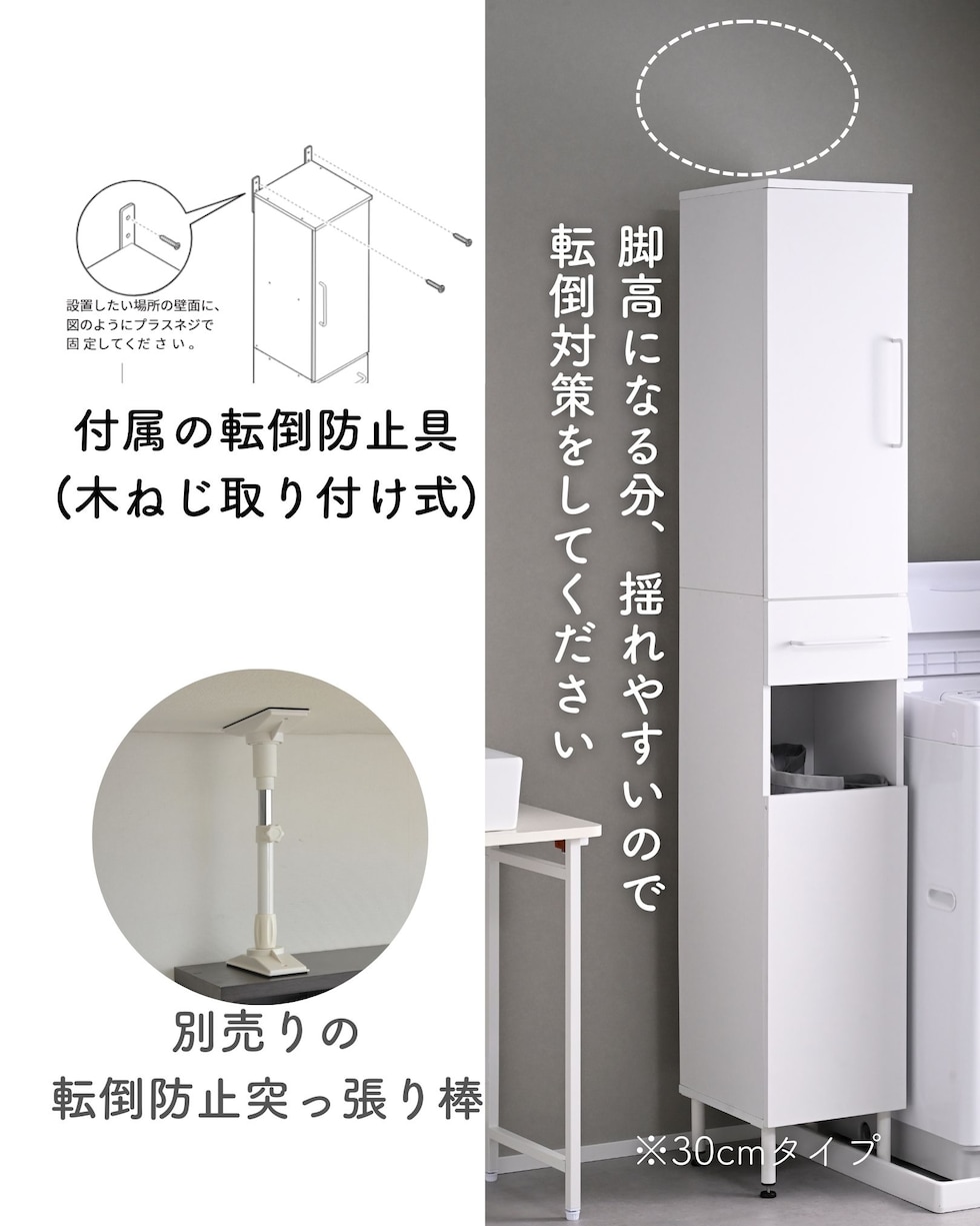 | 商品説明 | ●プラスドライバーをご用意ください。 ●洗濯バッグを隠せる、隙間ランドリーラック ●防水パンをまたいで設置できる、アジャスター脚付きタイプ ●上部は固定棚1枚、可動棚2枚で小分けされた扉収納スペース ●扉はスライドヒンジ式で、左右開き方を選択して設置可能 ●中腹には小物をしまえる浅型引き出し1杯 ●引き出しは抜け落ちを防いで出し入れを助ける、金属レール付き ●下部は洗濯用バッグを隠せるオープンスペース+可動式棚板1枚 ●脚の長さ: 12cm ●アジャスター調整高さ: 2.5cm ※ネジの長さは4.7cmありますが、安全に使える範囲は2.5cmです。 ●可動式棚板: 上部用2枚、下部用1枚、各3.2cm、3段階 ●下部内寸: 間口幅24.5 幅26.5 奥行26.5/29 高さ(上)62/(棚下)14.5cm ※可動棚を中央に設置時 ●下部開口部: タテ19.5×ヨコ26.5cm ●引き出し内寸: 幅20.5 奥行23 深さ7cm、間口奥行14cm ●引出しスライド幅15.5cm ●上部扉内寸: 間口幅24.5 幅26.5 奥行26.5/29 高さ各段17※cm ※可動棚を中央に設置時 ●耐荷重: 全体75kg、天板10、棚1段10、引出し5kg ●木ネジ打ち付け式の転倒防止ベルト付属 ●背面化粧あり |