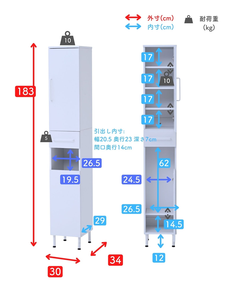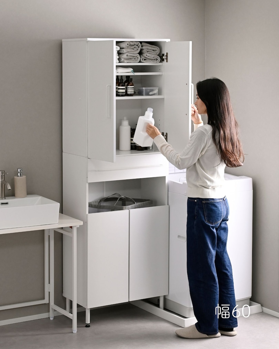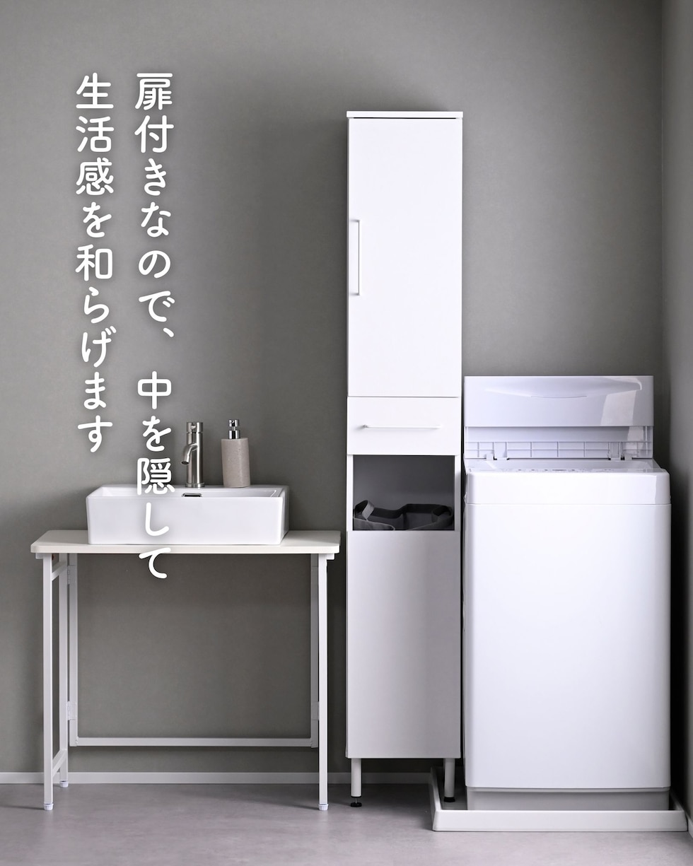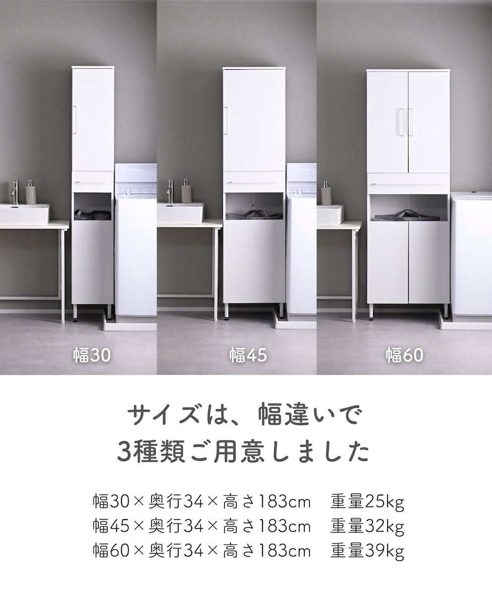 | 商品説明 | ●プラスドライバーをご用意ください。 ●洗濯バッグを隠せる、隙間ランドリーラック ●防水パンをまたいで設置できる、アジャスター脚付きタイプ ●上部は固定棚1枚、可動棚2枚で小分けされた扉収納スペース ●扉はスライドヒンジ式で、左右開き方を選択して設置可能 ●中腹には小物をしまえる浅型引き出し1杯 ●引き出しは抜け落ちを防いで出し入れを助ける、金属レール付き ●下部は洗濯用バッグを隠せるオープンスペース+可動式棚板1枚 ●脚の長さ: 12cm ●アジャスター調整高さ: 2.5cm ※ネジの長さは4.7cmありますが、安全に使える範囲は2.5cmです。 ●可動式棚板: 上部用2枚、下部用1枚、各3.2cm、3段階 ●下部内寸: 間口幅24.5 幅26.5 奥行26.5/29 高さ(上)62/(棚下)14.5cm ※可動棚を中央に設置時 ●下部開口部: タテ19.5×ヨコ26.5cm ●引き出し内寸: 幅20.5 奥行23 深さ7cm、間口奥行14cm ●引出しスライド幅15.5cm ●上部扉内寸: 間口幅24.5 幅26.5 奥行26.5/29 高さ各段17※cm ※可動棚を中央に設置時 ●耐荷重: 全体75kg、天板10、棚1段10、引出し5kg ●木ネジ打ち付け式の転倒防止ベルト付属 ●背面化粧あり |