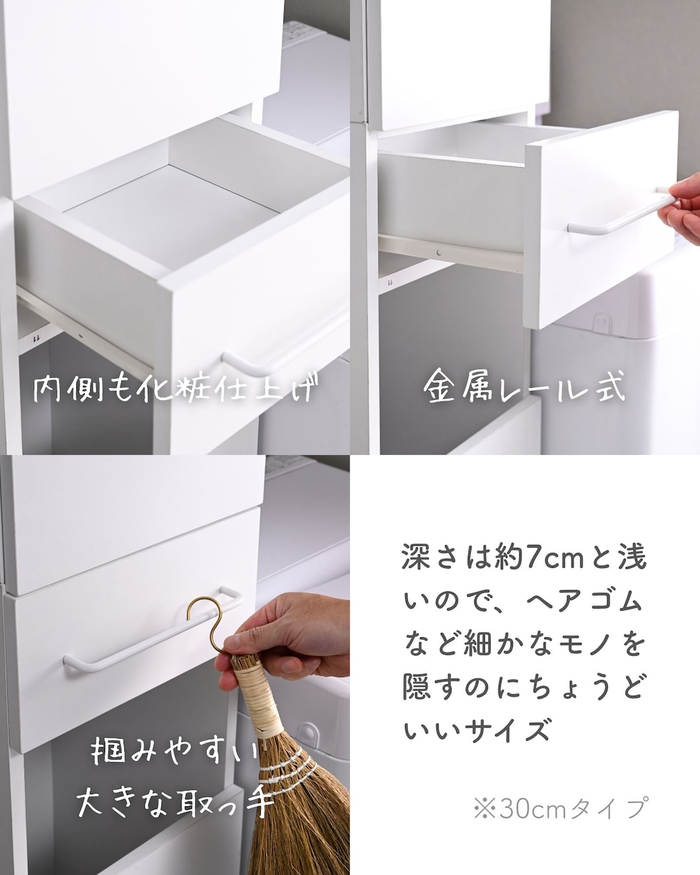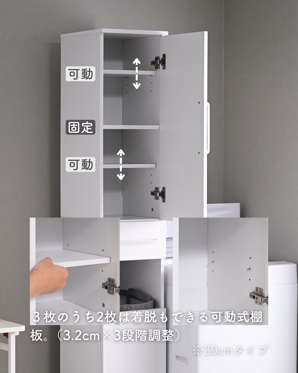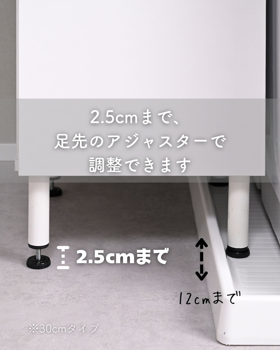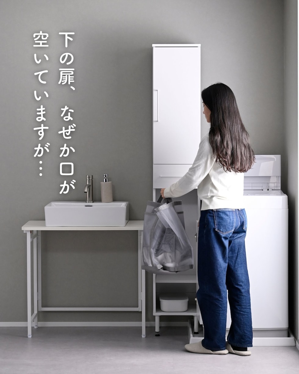 | 商品説明 | ●プラスドライバーをご用意ください。 ●洗濯バッグを隠せる、隙間ランドリーラック ●防水パンをまたいで設置できる、アジャスター脚付きタイプ ●上部は固定棚1枚、可動棚2枚で小分けされた扉収納スペース ●扉はスライドヒンジ式で、左右開き方を選択して設置可能 ●中腹には小物をしまえる浅型引き出し1杯 ●引き出しは抜け落ちを防いで出し入れを助ける、金属レール付き ●下部は洗濯用バッグを隠せるオープンスペース+可動式棚板1枚 ●脚の長さ: 12cm ●アジャスター調整高さ: 2.5cm ※ネジの長さは4.7cmありますが、安全に使える範囲は2.5cmです。 ●可動式棚板: 上部用2枚、下部用1枚、各3.2cm、3段階 ●下部内寸: 間口幅24.5 幅26.5 奥行26.5/29 高さ(上)62/(棚下)14.5cm ※可動棚を中央に設置時 ●下部開口部: タテ19.5×ヨコ26.5cm ●引き出し内寸: 幅20.5 奥行23 深さ7cm、間口奥行14cm ●引出しスライド幅15.5cm ●上部扉内寸: 間口幅24.5 幅26.5 奥行26.5/29 高さ各段17※cm ※可動棚を中央に設置時 ●耐荷重: 全体75kg、天板10、棚1段10、引出し5kg ●木ネジ打ち付け式の転倒防止ベルト付属 ●背面化粧あり |