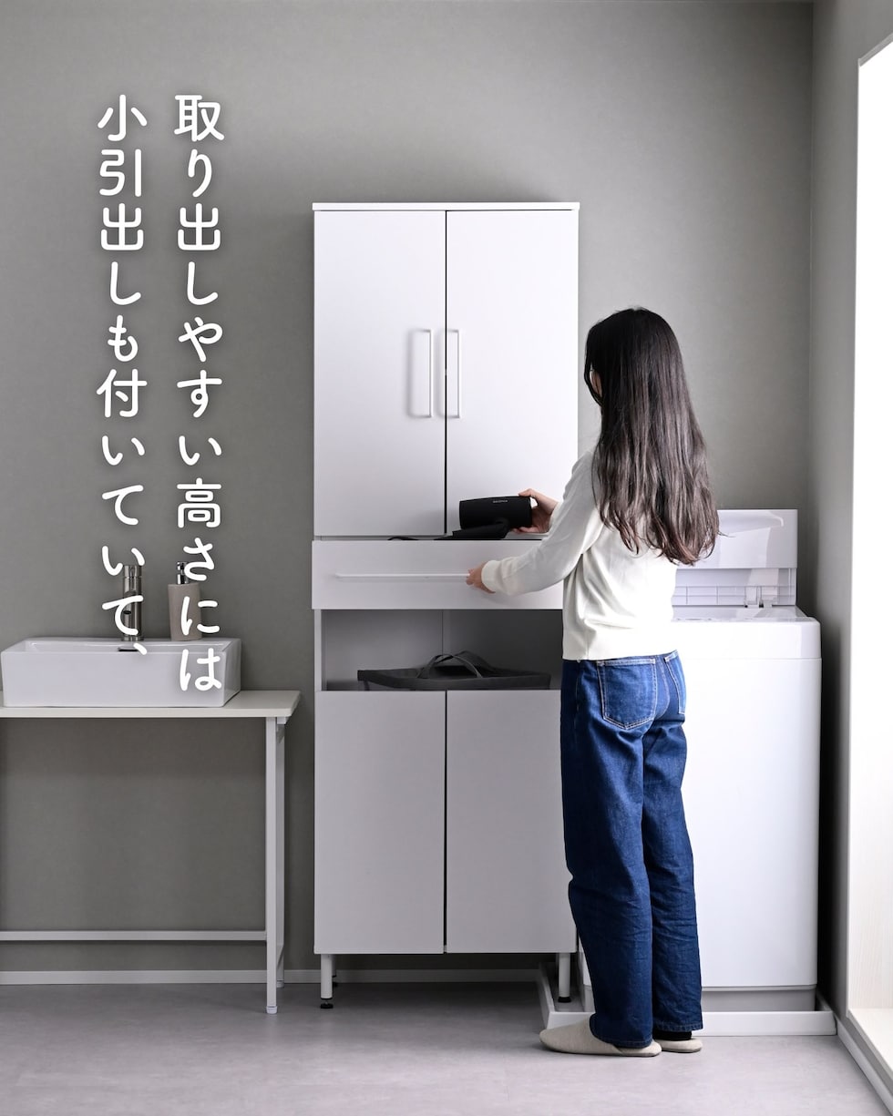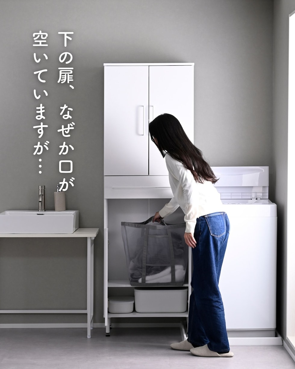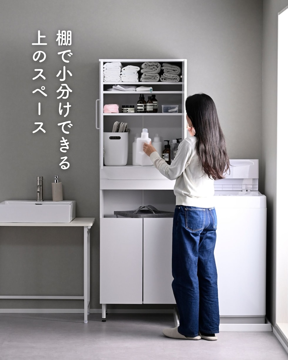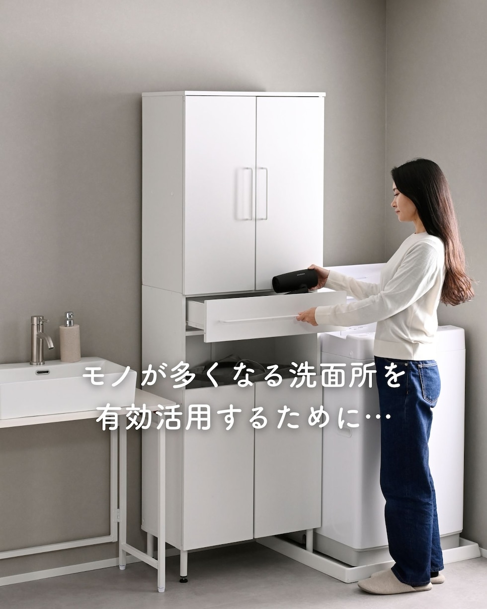 | 商品説明 | ●プラスドライバーをご用意ください。 ●洗濯バッグや洗濯カゴを隠せる、隙間ランドリーラック ●防水パンをまたいで設置できる、アジャスター脚付きタイプ ●上部は固定棚1枚、可動棚2枚で小分けされた扉収納スペース ●扉はスライドヒンジでの調整式 ●中腹には小物をしまえる浅型引き出し1杯 ●引き出しは抜け落ちを防いで出し入れを助ける、金属レール付き ●下部は洗濯用バッグを隠せるオープンスペース+可動式棚板1枚 ●脚の長さ: 12cm ●アジャスター調整高さ: 2.5cm ※ネジの長さは4.7cmありますが、安全に使える範囲は2.5cmです。 ●可動式棚板: 上部用2枚、下部用1枚、各3.2cm、3段階 ●下部内寸: 間口幅52 幅56 奥行26.5/29 高さ(上)62/(棚下)14.5cm ※可動棚を中央に設置時 ●下部開口部: タテ19.5×ヨコ56.5cm ●引き出し内寸: 幅51 奥行23 深さ7cm、間口奥行14cm ●引出しスライド幅15.5cm ●上部扉内寸: 間口幅52 幅56 奥行26.5/29 高さ各段17※cm ※可動棚を中央に設置時 ●耐荷重: 全体75kg、天板10、棚1段10、引出し5kg ●木ネジ打ち付け式の転倒防止ベルト付属 ●背面化粧あり |