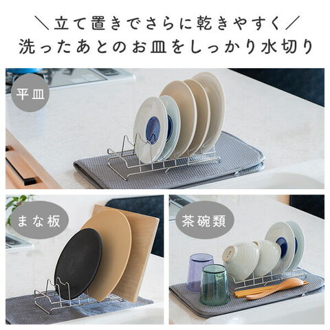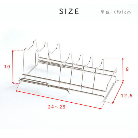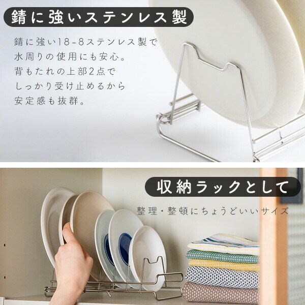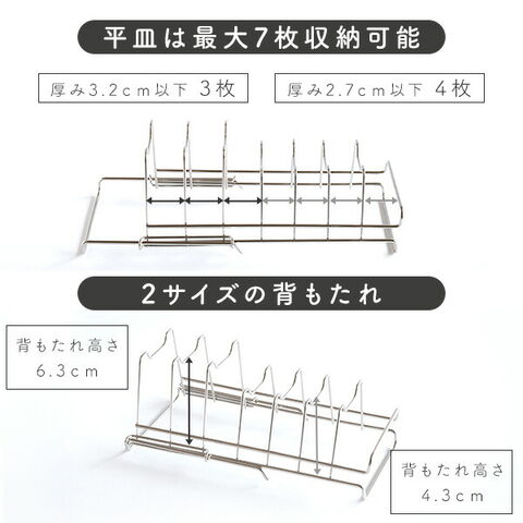 | 商品説明 | ●立てられない平皿を立てて乾かせる、ステンレス製のディッシュスタンド ●すっきり暮らす水切りかごとセット使いできる便利なお皿立て ●脚部分を伸ばすことで、すっきり暮らす水切りかごスクエアの上に設置することが可能 ●縮めれば、スクエアかごの中にもフィット ●食器棚や引き出しで皿立てとしても活躍 ●18-8ステンレスでサビに強く、食洗機対応 ●お皿は最大7枚収納可能。(厚み3.2cm×3枚、2.7cm×4枚まで) ●耐荷重: 全体3kg、背もたれワイヤー部1本あたり1kg |