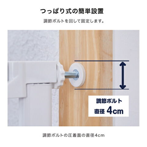 | 商品説明 | ●シンプルでインテリアに馴染む安全ゲート ●選べる2サイズ ・Sサイズ(取り付け可能幅61-71cm) ・Mサイズ(取り付け可能幅68-78cm) ●使用対象:生後24か月以内 ●調節ボルト直径:4cm ●つっぱり式の簡単設置 ●便利な前後両開き扉 ●片手で操作して簡単に開閉 ●90度まで開くと固定される解放機能付き ●お子様が簡単に開けることができないダブルロック式 ●自動で閉まる仕様で閉め忘れを軽減 |