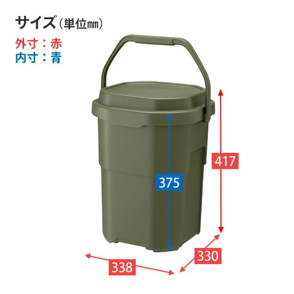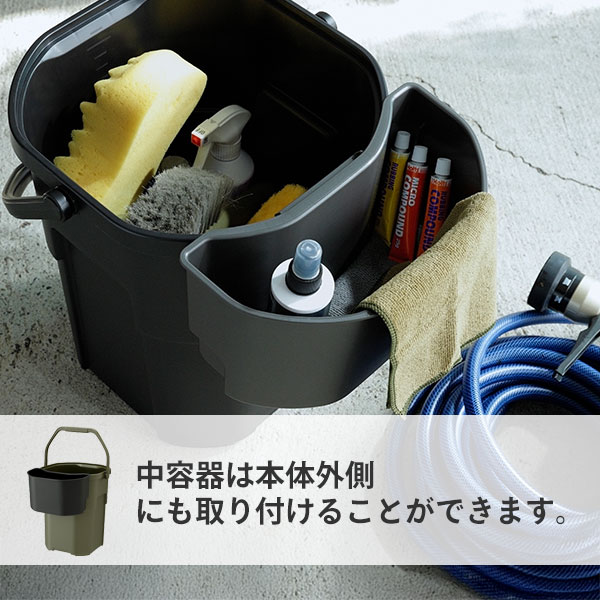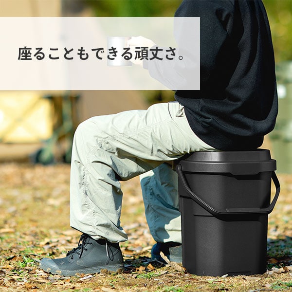 | 商品説明 | ●長尺物や液体を運搬できる、座れるフタ付きバケツ型容器 ●容量:22L ●耐荷重:100kg ●内寸高さが約37.5cmあり、長さのあるものも収納可能 ●片手で持ち運びやすく水平に固定もできるハンドル ●小物を整理・収納できる中容器付き ●中容器は本体外側にも取り付け可能 ●外したフタは本体に引っ掛けて固定可能 |
