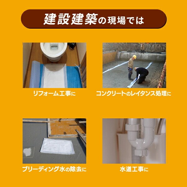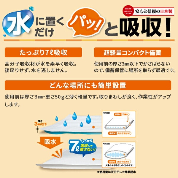| 商品説明 | ●1枚で約7Lの水を吸収 ※海水、油は吸収しません ●身のまわりの水処理、雨漏り、浸水防止に ●使用前は厚さ約3mm、重さ約60gと保管にも最適 ●銀イオン加工 ●安心と信頼の日本製 ●10枚入×10袋でのお届け ※止水材としての使用は出来ません ※使用後は3日程天日干し、もしくは脱水剤を利用して排水後に地域の規則に従って廃棄してください ※吸水後の再利用は出来ません |