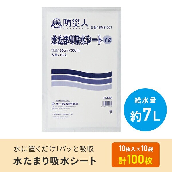 防災人 水たまり吸水シート 7L 10枚入り×10袋(100枚) 日本製 BMS-001 吸水シート 雨漏り 水漏れ 浸水 水抜き 水たまり キッチン トイレ 防災 暴風雨対策 備蓄 備え 防災用品 防災グッズ 非常用 軽量 コンパクト まとめ買い 第一衛材 【送料無料】