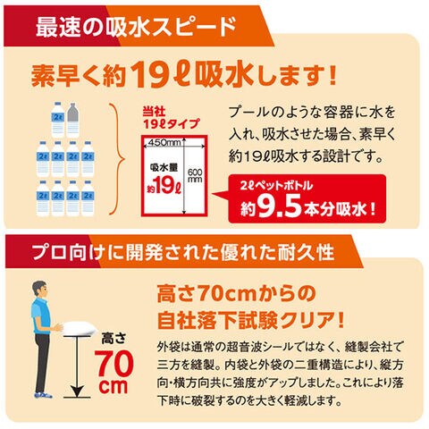 | 商品説明 | ●1枚で約19Lの水を吸収 ※海水、油は吸収しません ●吸水土のうとしても使用可能 ●高さ70cmからの落下試験クリア ●使用前は薄くて軽量のため備蓄にも最適 ●吸水後サイズ:約35×50×14cm ●10枚入×5袋でのお届け ※使用後は3-7日程天日干し、もしくは離水剤を利用して脱水した後に地域の規則に従って廃棄してください ※保管する際はできるだけ密閉できる袋に入れてください ※膨らんだ後のものは滑りやすく危険ですので決して踏まないでください |