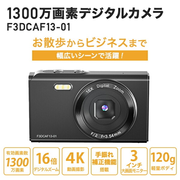 | FFF フィールドスリー コンパクトデジタルカメラ 1300万画素 16倍デジタルズーム 静止画 4K動画 手振れ補正 F3DCAF13-01 ブラック |