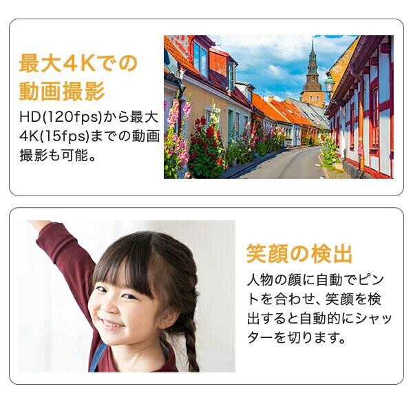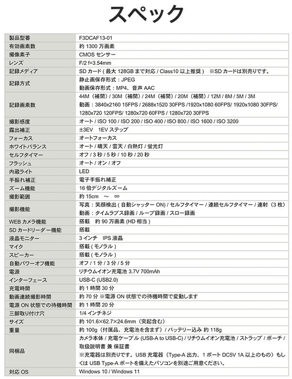 | 商品説明 | ●有効画素数:約1300万画素 ●16倍デジタルズーム ●4K動画撮影 ●手振れ補正機能搭載 ●液晶モニター:3インチ ●SDカードリーダー機能搭載 ●SDカード(最大128GB/Class10以上推奨)※別売 ●付属品:カメラ本体、充電ケーブル(USB-A to USB-C) 、 リチウムイオン充電池、ストラップ、ポーチ、取扱説明書/保証書 ●対応OS:Windows 10、Windows 11 ※充電器:別売り ※バッテリーを取り外したり、充電が無くなった状態で長時間使用しなかった場合、日付/時刻や設定がリセットされます。その場合は再度設定してください。 |