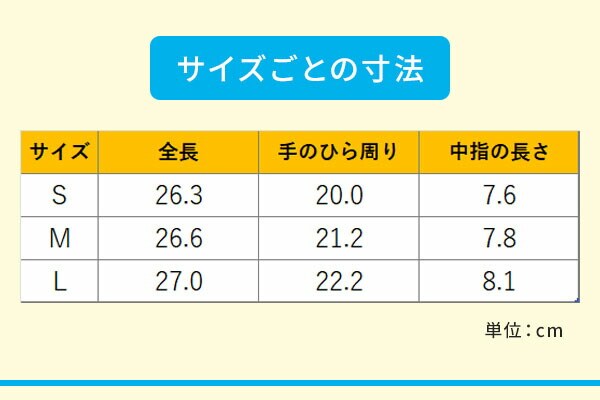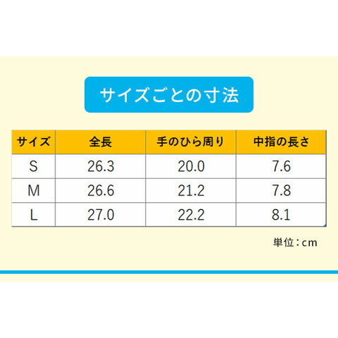 | 本体サイズ | S:全長 26.3cm 手のひら周り 20.0cm、中指の長さ 7.6cm M:全長 26.6cm 手のひら周り 21.2cm、中指の長さ 7.8cm L:全長 27cm 手のひら周り 22.2cm、中指の長さ 8.1cm |