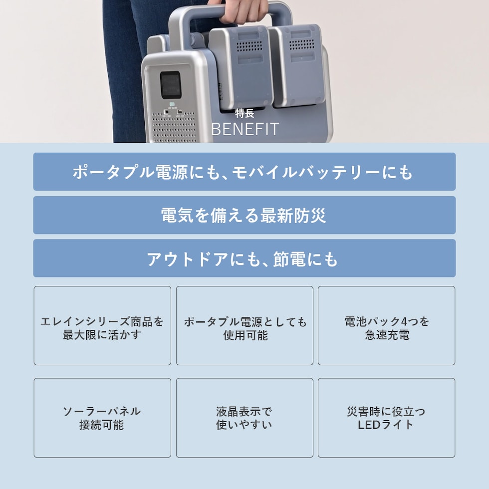 | 商品説明 | ●300W出力のポータブル電源としても使えて4つのバッテリーパックを同時に充電。ELEINシリーズを最大化するステーション 【バッテリーステーション】 ●ポータブル電源の便利さとモバイルバッテリーの手軽さを合わせ持つ頼れるバッテリーステーション ●もしもの停電でも自由に使える「電気の備え」 ポータブル電源&モバイルバッテリーは最新の防災機器 ●キャンプやお庭での利用でアウトドアを快適に ●ソーラーパネル(別売)との併用で毎日の電気をお得に備蓄する節電の使い方も ●AC電源に加え、TypeA/TypeCで接続できる家電に使用可能 300W出力のポータブル電源としても使えて定格出力/純正弦波だから使い勝手も抜群 ●電池パックを4つ同時に充電できるステーション。これひとつでバッテリーパックの使い回し自由自在 エレインシリーズのバッテリーパックを4つ同時に充電可能。※1つあたり約56分で充電完了 ●液晶表示で使いやすく。充電電力や出力電力も一目で分かる ●災害時に役立つLEDライト搭載 ●搭載バッテリー数:最大4個 ●適用バッテリータイプ:リチウムイオンバッテリー18V(型番:YDB-5A) ●動作温度:0?40℃ ●充電温度:0?40℃ 充電情報 ●AC充電:AC100V-240V 50Hz/60Hz 最大100W ●ソーラー充電:DC12V-26V コネクタ:XT60 最大100W 出力情報 ●AC出力:AC100V 50Hz 純正弦波 最大300W ●USB-C出力:5V⎓3A/9V⎓3A/12V⎓3A/15V⎓3A/20V⎓3.25A(最大65W) 充電プロトコル:PD 3.0、BC 1.2、Apple 2.4A、QC 4.0+、QC 3.0、QC 2.0、Samsung AFC USB-A出力:5V=2.4A(最大12W) 【電池パック】 ●ELEINシリーズの電池パック ●ELEINシリーズのさまざま製品をこの1台で使用可能 ●バッテリーなのに安定持続 ●急な電池切れに困らない電池残量表示機能付き ●充電時間:約2時間 ●定格:DC18V 5Ah 90Wh ●USB Type-C出力:PD20W DC5V/3A,DC9V/2.2A,DC12V/1.67A 軽くてコンパクトにまとまるから持ち運びがカンタン ●ポータブル電源に接続可能。自然の力でエコ充電 ●20%を超える発電効率で太陽光を効率的に電気に変換 ●USB-A/USB-C/DC5521/×T60/×T30の5種の端子に対応 エレインシリーズのポータブル電源とポータブル保冷温庫にも直接接続可能 【YSP-M100】 ●最大動作電力100W ●最大動作電圧21.6V ●最大出力電流4.6A ●開放電圧24.8V ●短絡電流5.3A ●2つ折りで約3.4kg ●USB-A 端子×1:5V 3A,9V 2A,12V 1.5A ●USB-C 端子×1:5V 3A,9V 3A,12V 3A,15V 3A,20V 3.25A ●DC5521 端子×1:21.6V 4.6A ●XT60 端子×1:21.6V 4.6A ●XT30 端子×2:21.6V 4.6A |