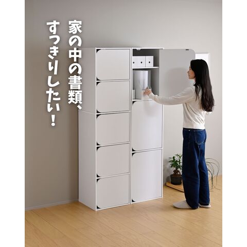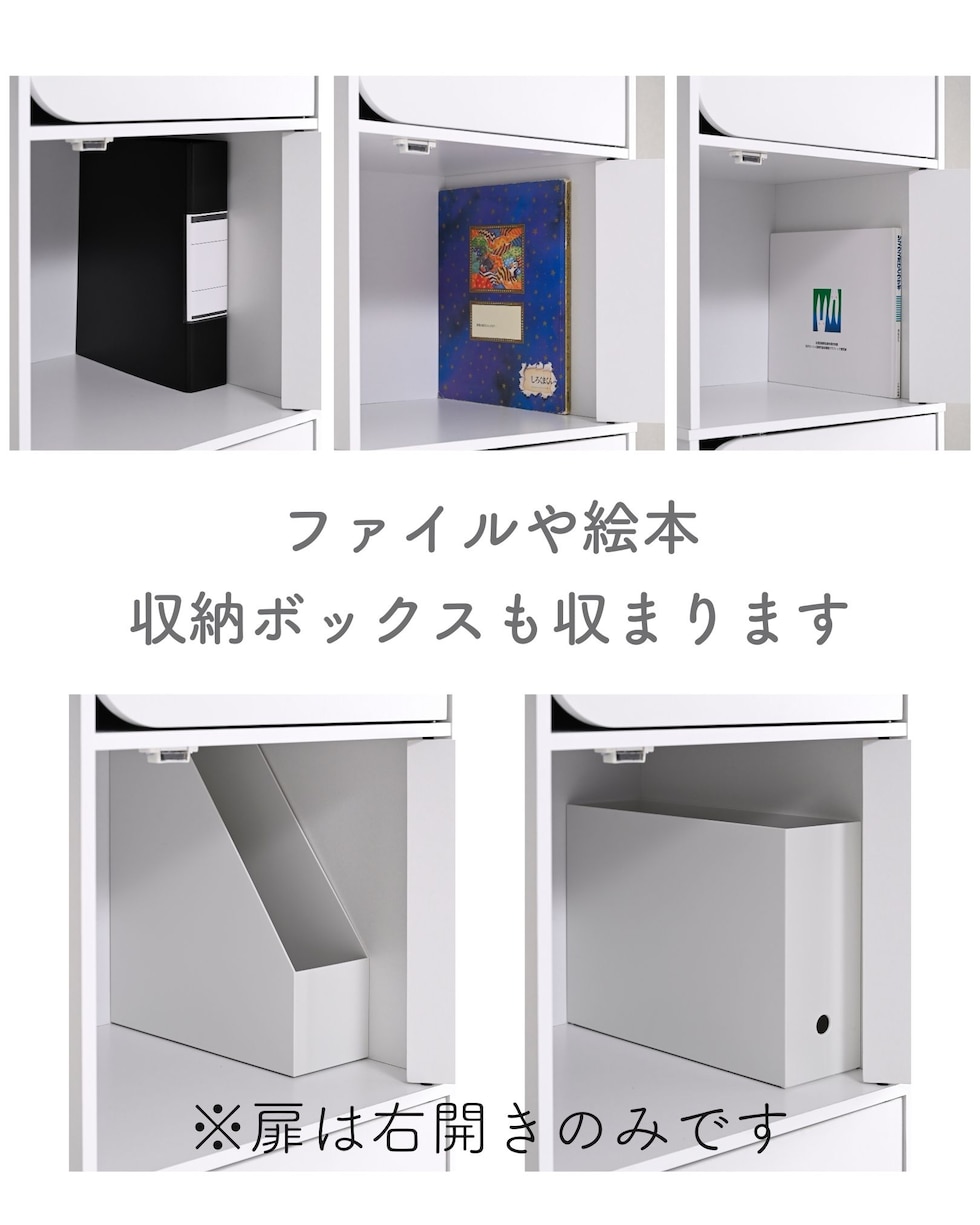 | 商品説明 | ●プラスドライバー、マイナスドライバーをご用意ください。 ●A4ファイルなどの書類をすっきり隠せる、扉付きの収納ラック ●右開き式の扉で、角の隙間は取っ手代わりのデザイン ●各段にA4ファイルを収納可能 ●扉は右開きのみ、左右付け替え不可 ●内寸: 間口幅36 幅39 奥行34.5 高さ31(32.5※) ※左端から約11cmの箇所には厚み1.5cmの扉受けマグネットあり ●背面化粧なし ●耐荷重: 固定棚20、天板20、全体120kg |