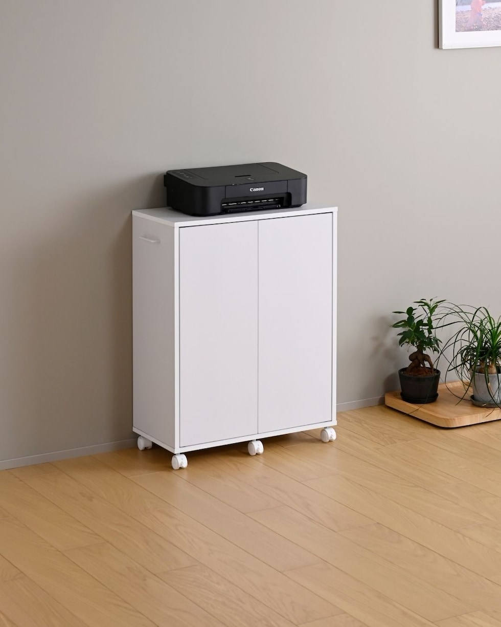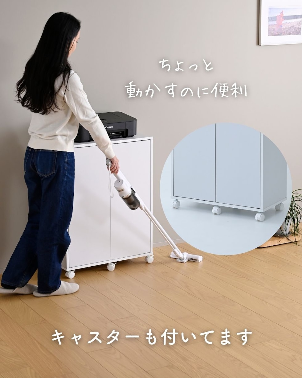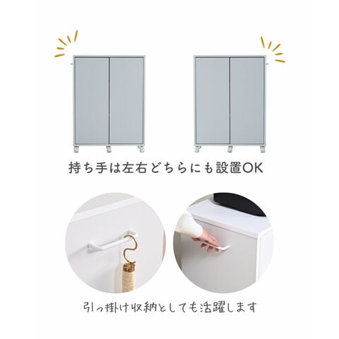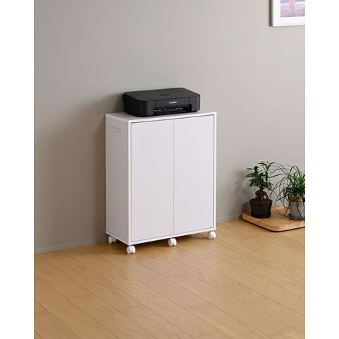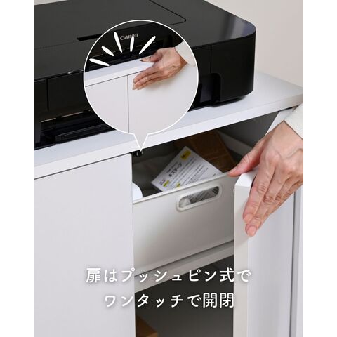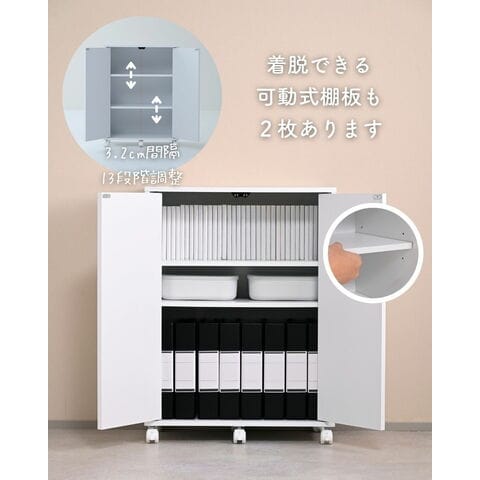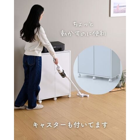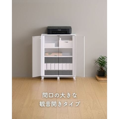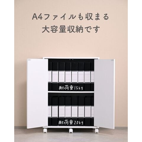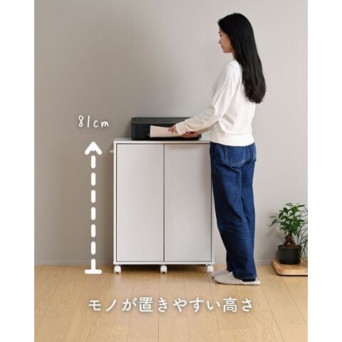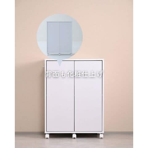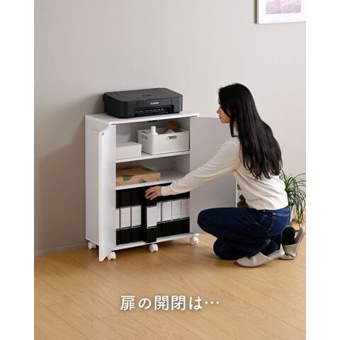| 商品説明 | ●プラスドライバーとマイナスドライバーをご用意ください。 ●A4ファイルなどの書類をすっきり隠せる、扉付きの収納ラック ●キャスター付きで掃除や模様替えをサポート ●養生を別途行えば、キャスターを付けずに利用可能 ●扉はプッシュピン式で、ワンタッチで開閉 ●可動式棚板2枚、3.2cm間隔、13段階 ●扉内寸:幅56.5 奥行24.5 高さ71.5cm ●間口幅50.5cm、マグネットまで高さ70cm ●棚板内寸高さ: (上から)21.5(マグネットまで19.5)/24/23cm ※棚は上から3、11段目に設置時 ●キャスター5個、うちストッパー付き2個 ●耐荷重: 天板20、棚板15、底板20、全体70kg ●取っ手は着脱式、かつ左右どちらにも設置可能 ●背面化粧あり |