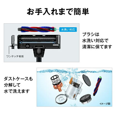 | 商品説明 | ●強烈な吸引力を軽々使える軽量1.6kgのサイクロン式クリーナー ●ヘッド幅約23cmの自走式パワフルスマートヘッド搭載, ●ごみくっきりライト:見えにくいごみも浮かび上がらせる緑色LEDライト ●からまんブラシ:髪の毛などがからまりにくいループ形状のブラシ ●からまんプレス構造:ダストケースは髪の毛などがからまりにくくお手入れがラク ●ブラシとダストケースは水洗い対応 ●置くだけで充電できるスタンド式充電台付き ●連続使用時間:ターボ/約6分、強/約15分、自動/約15-40分、標準/40分 ●充電時間:約2時間 ●電池定格電圧:DC25.2V ●集じん容積:0.25L ●電池:リチウムイオン電池(内蔵) ●付属品:ハンディブラシ、伸縮すき間用吸口、布用ブラッシングヘッド、ほうきブラシ、スマートホース、延長パイプ、スタンド式充電台、ACアダプター、お手入れブラシ ※連続使用時間、充電時間は一般社団法人日本電機工業会自主基準(HD-10)により測定。満充電、電池初期、室温20℃時。数値は使用方法、周囲温度、電池残量などの条件で異なります |