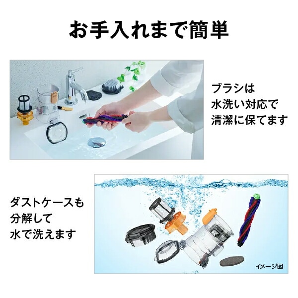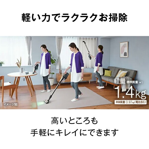 | 商品説明 | ●強烈な吸引力を軽々使える軽量1.4kgのサイクロン式クリーナー ●ヘッド幅約23cmの自走式パワフルスマートヘッド搭載, ●ごみくっきりライト:見えにくいごみも浮かび上がらせる緑色LEDライト ●からまんブラシ:髪の毛などがからまりにくいループ形状のブラシ ●からまんプレス構造:ダストケースは髪の毛などがからまりにくくお手入れがラク ●ブラシとダストケースは水洗い対応 ●置くだけで充電できるスタンド式充電台付き ●連続使用時間:強/約8分、自動/約8分-40分、標準/40分 ●充電時間:約2時間 ●電池定格電圧:DC21.6V ●集じん容積:0.15L ●電池:リチウムイオン電池(内蔵) ●付属品:ハンディブラシ、伸縮すき間用吸口、布用ブラッシングヘッド、ほうきブラシ、延長パイプ、スタンド式充電台、ACアダプター、お手入れブラシ ※連続使用時間、充電時間は一般社団法人日本電機工業会自主基準(HD-10)により測定。満充電、電池初期、室温20℃時。数値は使用方法、周囲温度、電池残量などの条件で異なります |