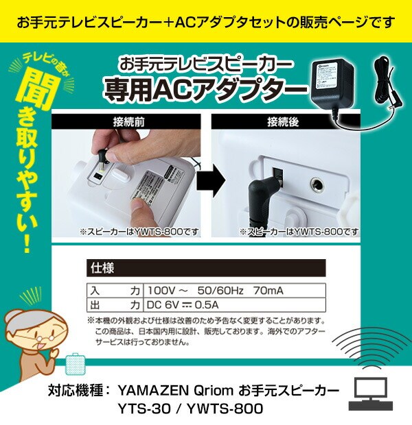 | 商品説明 | ●本体 ●電源:単3アルカリ乾電池×4本(別売)、またはACアダプター(別売) ●電池の連続持続時間:約45時間 ※音量が大きくなると短くなります ●最大スピーカー出力:1.3W(モノラル) ●イヤホン出力:モノラルイヤホン/ステレオヘッドホン対応(音声はモノラル) ●接続コードを本体の外部入力とテレビのイヤホン端子をつなげるだけの簡単接続 ●接続コード長さ:5m ●音量調節は本体音量つまみを回すだけ ●イヤホンで聞きたいときは本体イヤホン端子にイヤホン(別売)を接続 ●同梱内容:本体、接続コード ●メーカー保証:1年間 ●ACアダプター 手元スピーカーYTS-30、YWTS-800用ACアダプター ●入力:100V(50/60Hz) 70mA ●出力:DC6V(0.5A) |