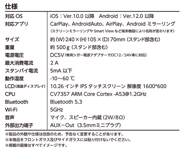 | 商品説明 | ●スマホとつなげてカーナビアプリを使用する ●Bluetooth・Wi-Fiでワイヤレス接続 ●対応OS:iOS Ver.10.0以降/Android Ver.12.0以降 ●対応アプリ:CarPlay/AirPlay/AndroidAuto/Androidミラーリング ●電源電圧:DC5V(専用シガー電源アダプタでDC12/24V車に対応) ●最大消費電流:2A ●スタンバイ電流:5mA 以下 ●動作温度:-10~60℃ ●LED(液晶ディスプレイ):10.26インチ IPSタッチスクリーン 解像度1600×600 ●CPU:CV7357 ARM Core Cortex-A53@1.2Ghz ●Bluetooth:5.3 ●Wi-Fi:5GHz ●音声:マイク、スピーカー内蔵(2W/8Ω) ●外部出力端子:AUX-Out(3.5mmステレオミニプラグ) ●付属品:専用シガー電源アダプター、専用スタンド、スタンド用ネジ、専用ドライバー、取扱説明書兼保証書 |