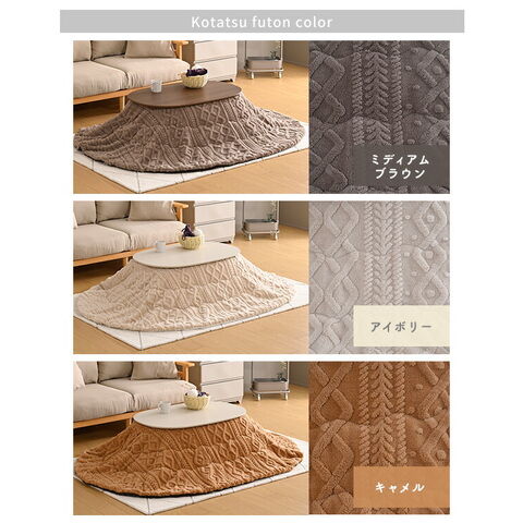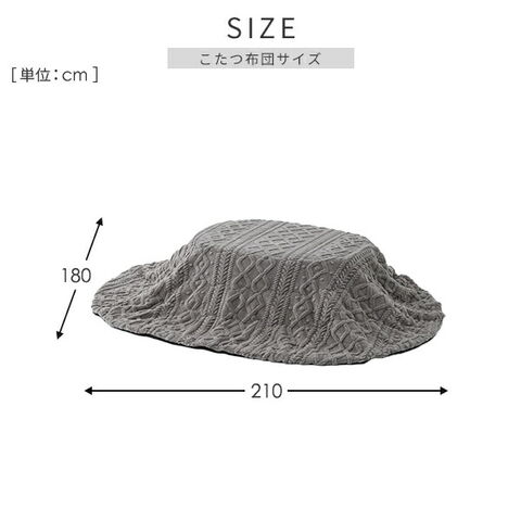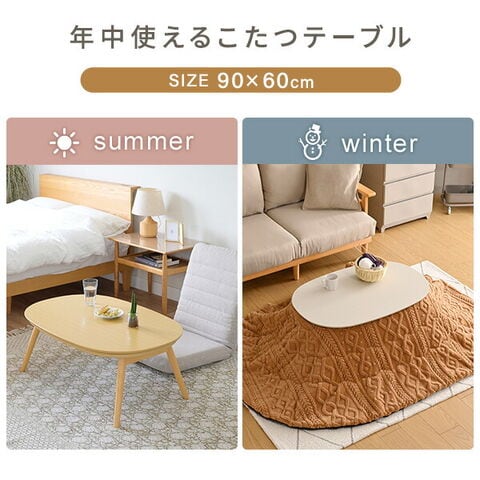 | 本体サイズ | こたつテーブル:幅90×奥行60×高さ36cm 重量13.2kg 折り畳み時サイズ:約15cm こたつ布団:約210×180cm 重量2.5kg |