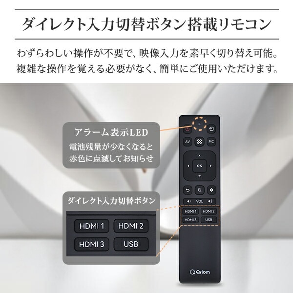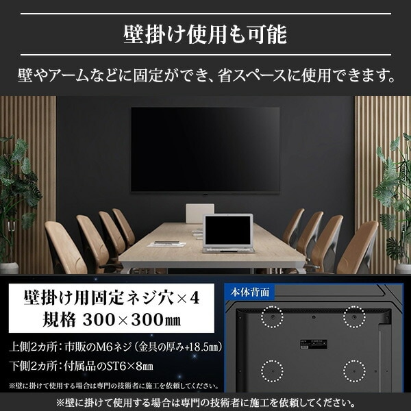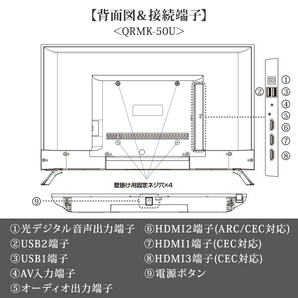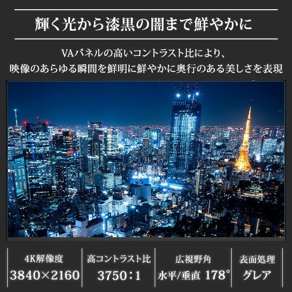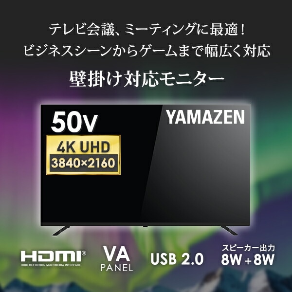 | 商品説明 | ●テレビ会議、ミーティングに最適 パソコンモニターとしてはもちろん、ゲーミングモニター、映画・動画の鑑賞、オフィスでの画面共有・オンライン会議にもおすすめです。 ●ダイレクト入力切替ボタン搭載リモコン ダイレクト入力切替ボタンを搭載し、リモコンボタンを1回押すだけで、映像入力を素早く切り替え可能です。わずらわしい操作は一切不要で複雑な操作を覚える必要がなく、誰でも簡単にご使用いただけます。また、リモコンの電池残量が少なくなると知らせる、電池低下アラーム表示機能により、機器が突然使えなくなる心配がなく、安心して作業を続けられます。 ●上下左右178度の高視野角で斜めから見てもキレイで鮮やかな映像を提供。 ●ストリーミングメディアプレーヤーやゲームに最適 ●リモコン電池電圧低下でアラーム表示(本体・リモコン) ●4K映像 フルハイビジョンの4倍の画素数で、高精細で美しい画像を映し出す4K(3840×2160ピクセル)対応。複雑な色合いの画像も滑らかに映し出すことができます。 ●他機器との接続 USB端子(×2)とHDMI端子(×3内1つはARC対応)、AV入力端子(×1)を搭載しているため、USBメモリ内のコンテンツ再生・ストレージとしての利用やAVケーブル・HDMIケーブル(別売)で外部機器との接続が可能です。 ●商品仕様 ・画面サイズ:50V型 ・解像度:3840×2160 ・コントラスト比:3750:1 ・アスペクト比:16:9 ・視野角:H/178°V/178°(標準値) ・最大スピーカー出力:8W+8W ・壁掛け寸法:VESA規格300×300 ・付属品:スタンド×2(ネジ4本含む)、リモコン(動作確認要単4形乾電池2本含む)、取扱説明書、保証書、VESAネジ×2(ST6×8mm・下側用)、AV信号アダプターケーブル |