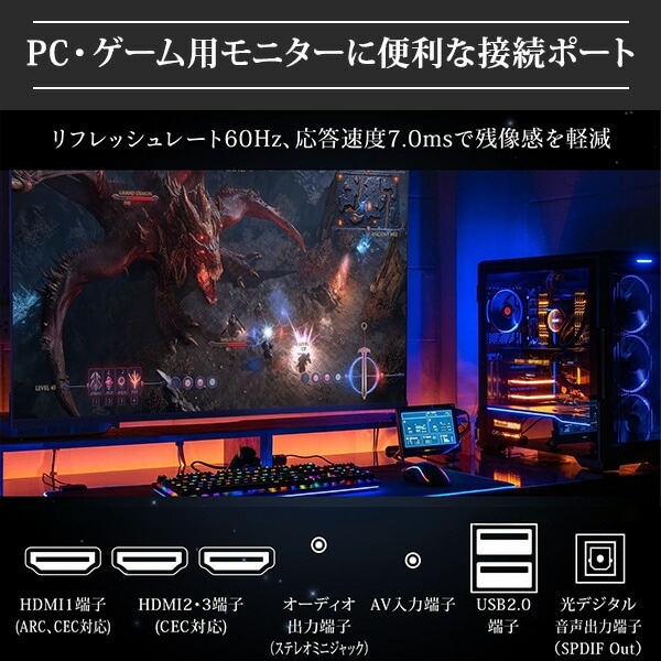 | 本体サイズ | (スタンドなし)111×8.8×64.4cm 重量9.2kg (スタンドあり)111×31×69.7cm 重量9.3kg |