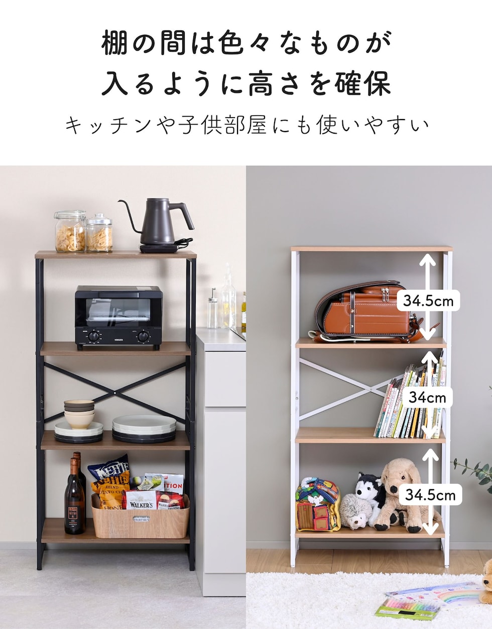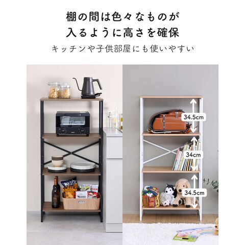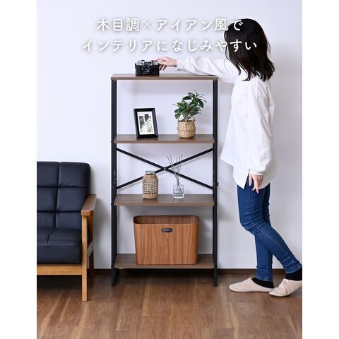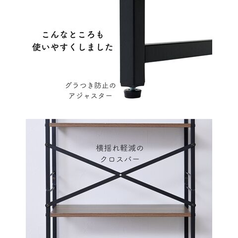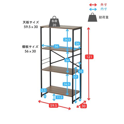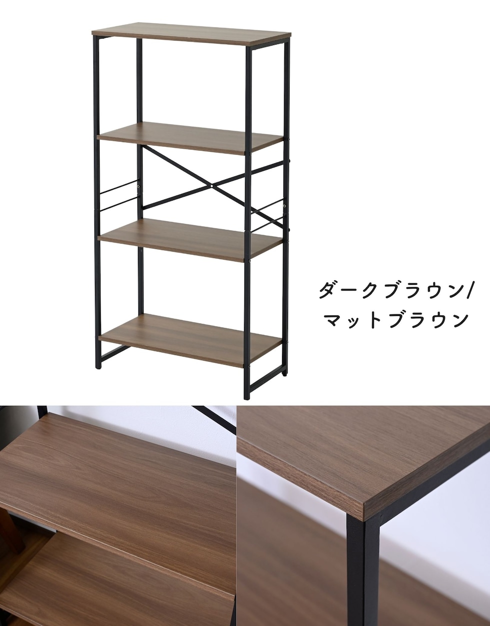 | 商品説明 | ※プラス、マイナスドライバーをご用意ください。 ●シンプルな木製棚板とアイアン風の4段ラック ●ツヤのないマットなフレーム ●奥行はスリムな30cm ●A4ファイルや市販の収納ケースがしまえる棚間 ●棚板は木の質感があってお手入れもかんたん ●傷や水に強いメラミンシートを採用 ●ガタつきを抑えるアジャスターとクロスバー付き ●天板サイズ: 幅59.5 奥行30cm ●棚板サイズ: 幅56 奥行30cm ●棚板間内寸: 上段、下段 幅56 奥行26 高さ34.5cm、中央 幅56 奥行26 高さ34cm ●床から棚板までの高さ: 11.5cm ●耐荷重: 1段あたり20kg、全体80kg |