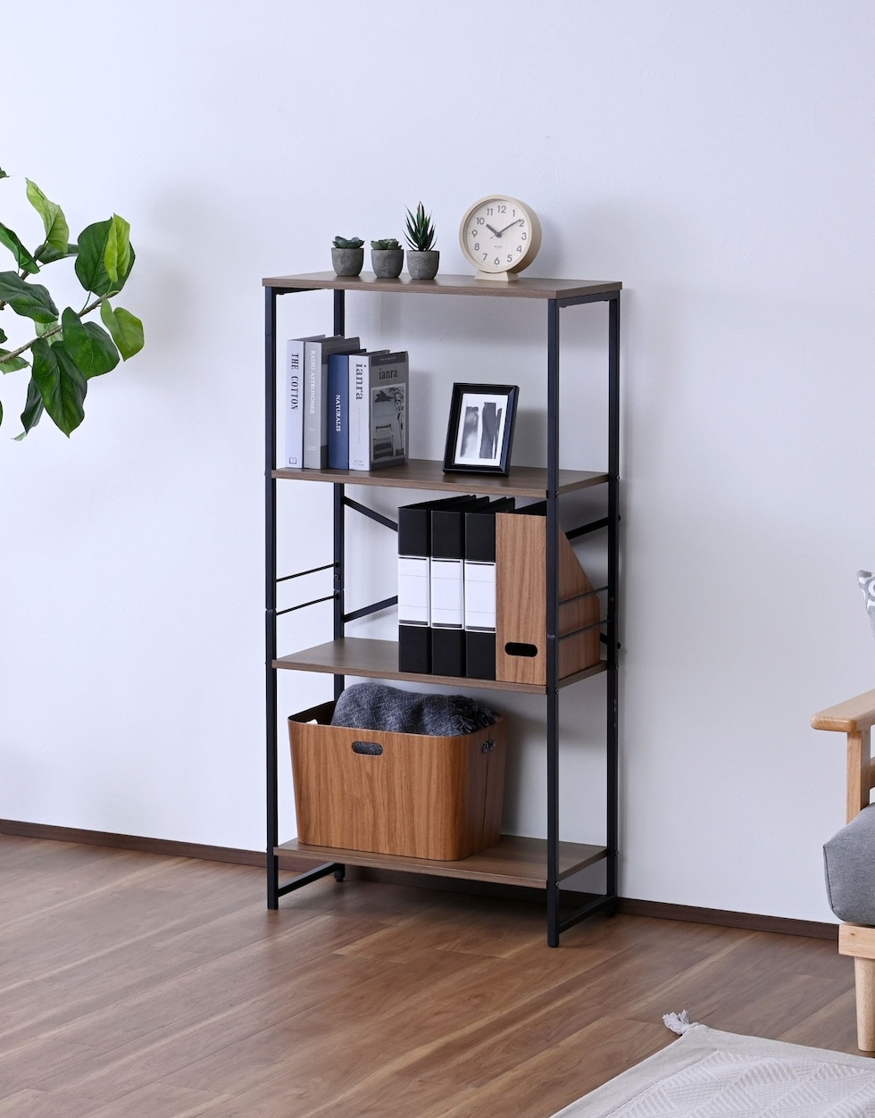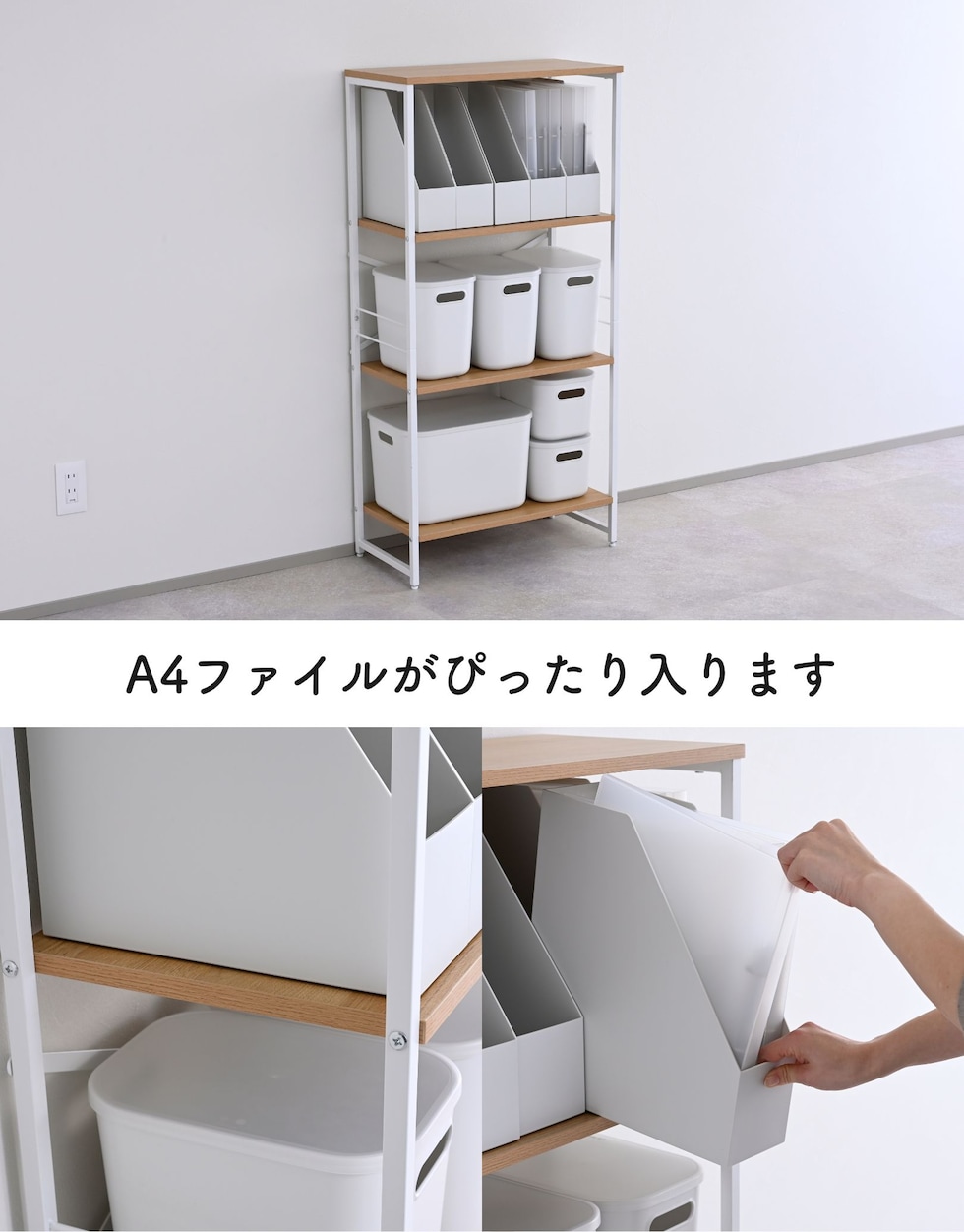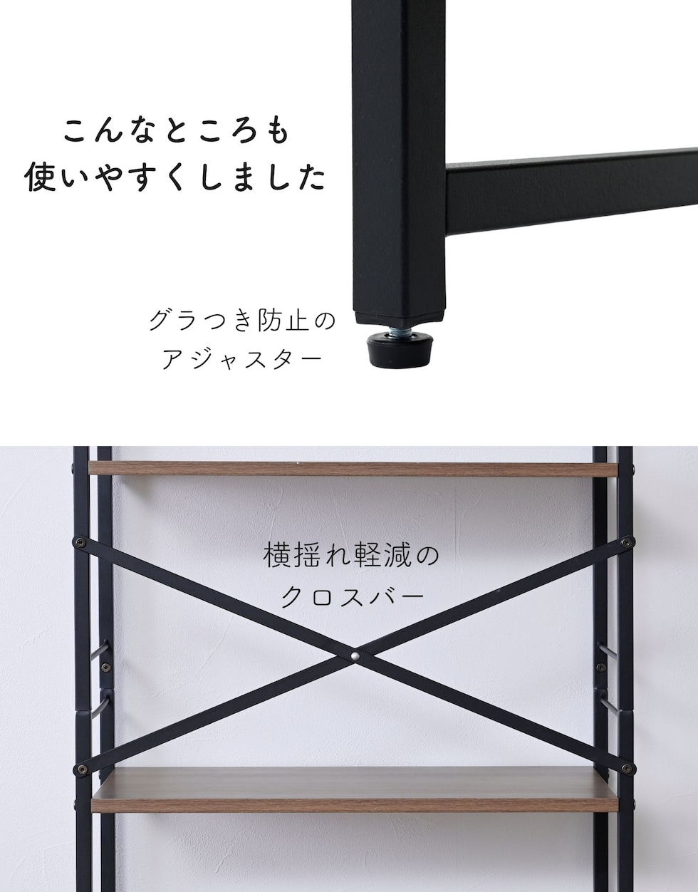 | 商品説明 | ※プラス、マイナスドライバーをご用意ください。 ●シンプルな木製棚板とアイアン風の4段ラック ●ツヤのないマットなフレーム ●奥行はスリムな30cm ●A4ファイルや市販の収納ケースがしまえる棚間 ●棚板は木の質感があってお手入れもかんたん ●傷や水に強いメラミンシートを採用 ●ガタつきを抑えるアジャスターとクロスバー付き ●天板サイズ: 幅59.5 奥行30cm ●棚板サイズ: 幅56 奥行30cm ●棚板間内寸: 上段、下段 幅56 奥行26 高さ34.5cm、中央 幅56 奥行26 高さ34cm ●床から棚板までの高さ: 11.5cm ●耐荷重: 1段あたり20kg、全体80kg |