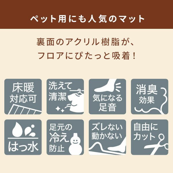 | 商品説明 | ●ぴたっと吸着して動かない!ペット用にも人気の撥水機能付きマット(9枚入) ●裏面のアクリル樹脂がフロアにぴたっと吸着しズレにくい ●洗えて清潔 ●消臭効果 ●自由にカット可能 ●床暖房対応 |