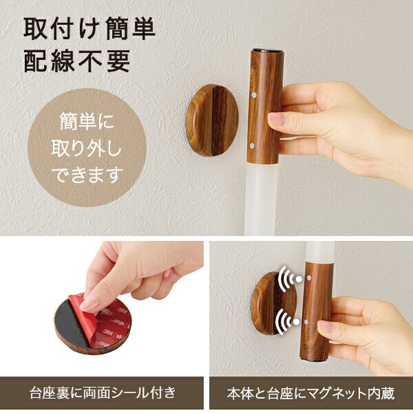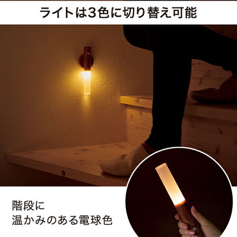 | 商品説明 | ●防災士監修 ●インテリアに馴染む木目調のセンサーライト ●両面シールやマグネットで壁に取り付け、ライト部分のみ取り外して手持ち使用もOK ●寝室、トイレやクローゼットで普段使いに。いざという時は懐中電灯替わりに ●電球色・昼光色・昼白色と設置場所に合わせて切り替え可能 ●乾電池式なので急な停電や防災の備えとしてもぴったり ●付属品:取り付け用スタンド、両面シール ●アルカリ乾電池(単4×2本) ※電池別売り |