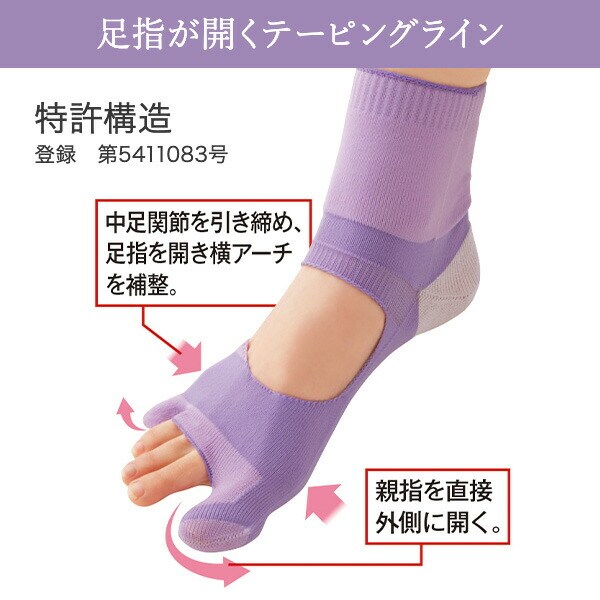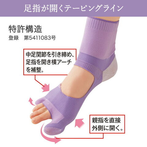 | 商品説明 | ●医学博士監修 ●特許取得の着圧ライン!中足関節を引き締め足指を開く&親指を直接外側に向けるライン形状のWサポートで、親指を外側に無理なく開く ●かかと部分にはアロエの保湿成分配合糸モイストを使用 ●縫い目が完全に無い特殊製法&必要な箇所のみ引き締める着圧形状で就寝中も快適 ●脱ぎ履きしやすいクルー丈で足首を包み込み温める ●靴下のように簡単に装着でき、洗濯機で丸洗いできるのでお手入れ簡単 ●薄手のメッシュ編みと甲、中3本指が開いてるので通気性が良く蒸れにくい ※洗濯の際は、洗濯ネットをご使用ください ※体重のかからない就寝時に履くことがおすすめです |