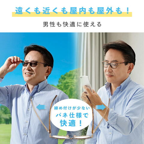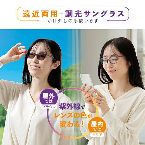 | 商品説明 | ●遠近両用+調光+紫外線予防 3つの機能がこれ1本で叶う便利なメガネ ●近くも遠くも見やすいから掛け外しの手間いらず ●上部は度なし、下部は老眼鏡になったバイフォーカル(2重焦点)仕様 ●紫外線の強さによって色が変化するサングラス機能レンズ ●UVカット率99%紫外線から目を守る ●眩しさによる目の疲れをやわらげる ●フレームは締め付けが少なくフィットするバネ丁番仕様 ※正確な度数は専門店などで計測してください。近視・遠視・乱視の方は当てはまらないことがあります。 |