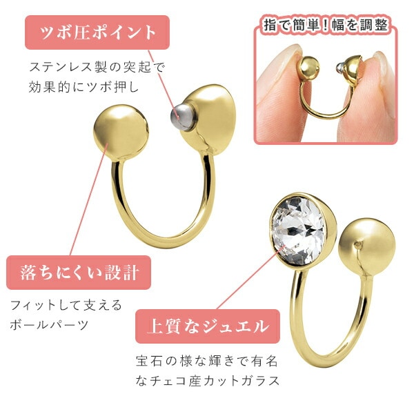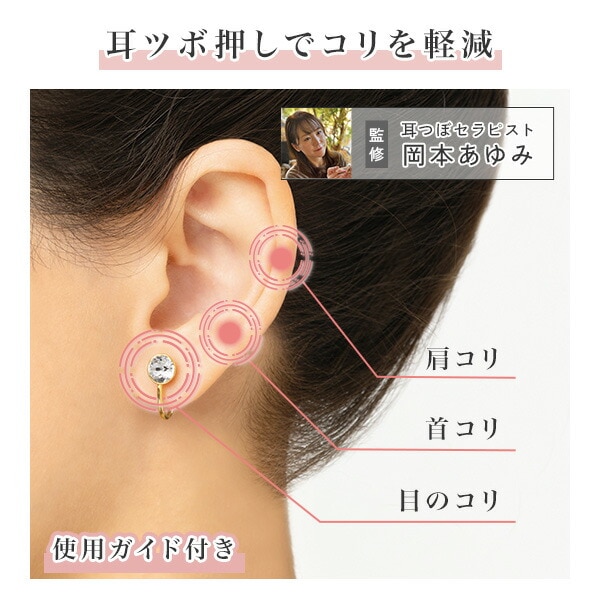 | 商品説明 | ●耳つぼセラピスト監修 ●肩・首のコリや目の疲れが軽減できる一般医療機器のイヤーカフ ●アクセサリーとして使えて、コリや疲れも軽減できる一石二鳥なアイテム ●シンプルなデザインだからお洋服を選ばない ●耳つぼに興味がある方に、サロンに行かなくても自宅で手軽に試せる ●繰り返し使用できるので、経済的 ●プレシオサ社、チェコ産のカットガラス使用でキラキラと上品な輝き ●挟むときの強弱は調節できるので、いろんな箇所に付けれる ※改造しないでください ※金属アレルギーの方は使用しないでください |