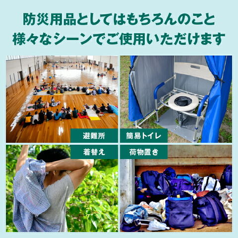 | 商品説明 | ●タテでもヨコでも使える2WAYテント ●ワンタッチで簡単に設置可能 ●簡易トイレの設置に、ちょっとした着替えに、避難所の寝床として! ●小窓2か所で換気が可能 ●小物(軽量)をかけられるベルト付き ●付属品:ロープ×4本、ペグ×4本 ●収納時サイズ:直径60cm |