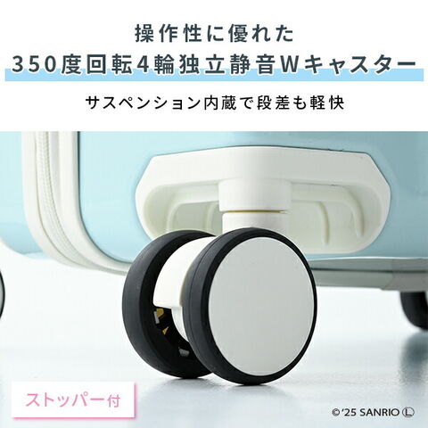 | 商品説明 | ●容量:95L ●TSAロック機能 ●PC+ABS樹脂の頑強ボディ(光沢仕上げ) ●両手で持てるから重さ軽減 ●シナモロールの総柄が可愛い内装 ●便利なサイドフック付き ●操作性に優れた350度回転4輪独立静音Wキャスター ●ストッパー付き ●タイヤはサスペンション内蔵で段差も軽快 ●ハンドルは3段階調整可能 |