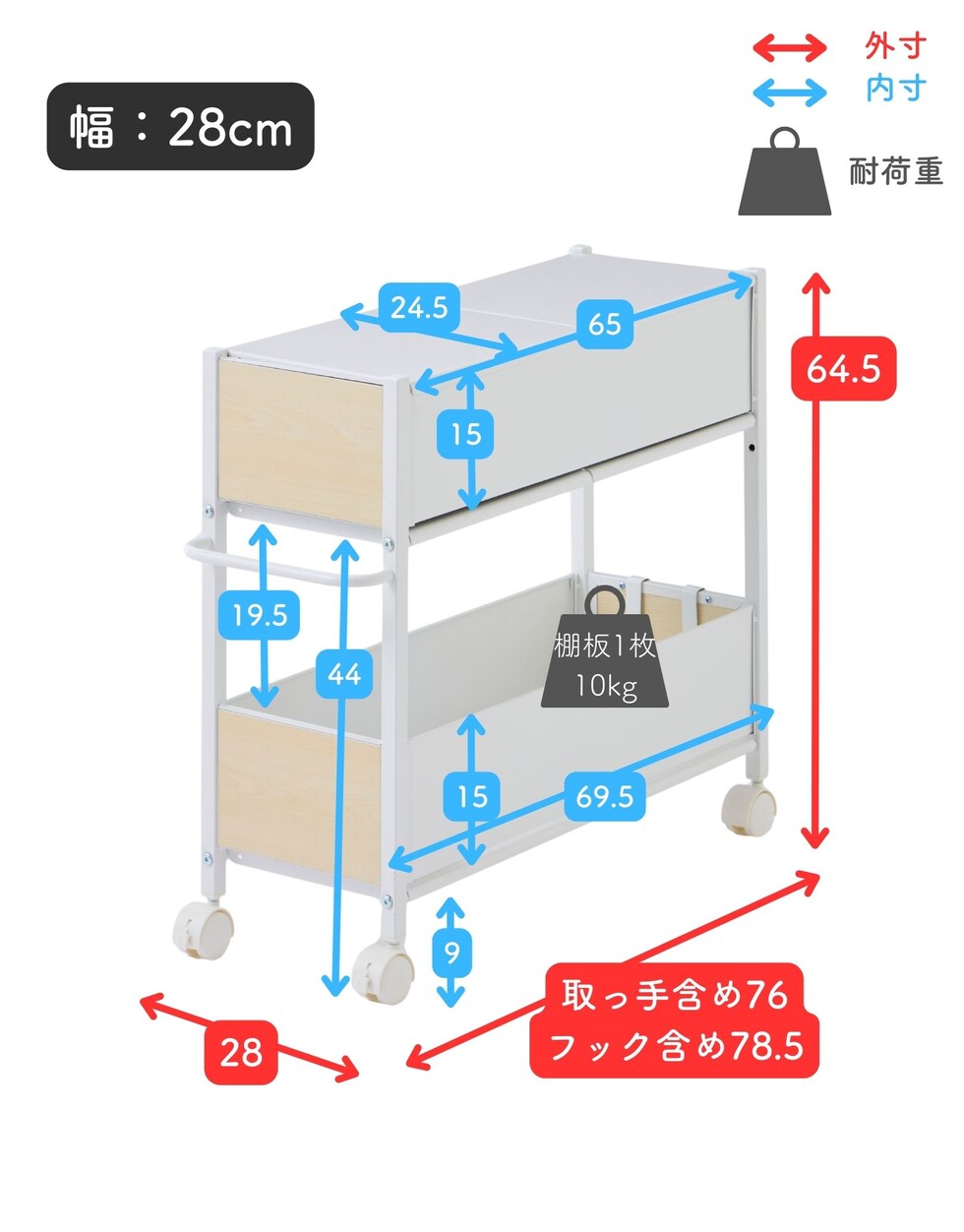 | 本体サイズ | 幅28x奥行76(フック含む78.5)x高さ64.5cm 重量10kg |