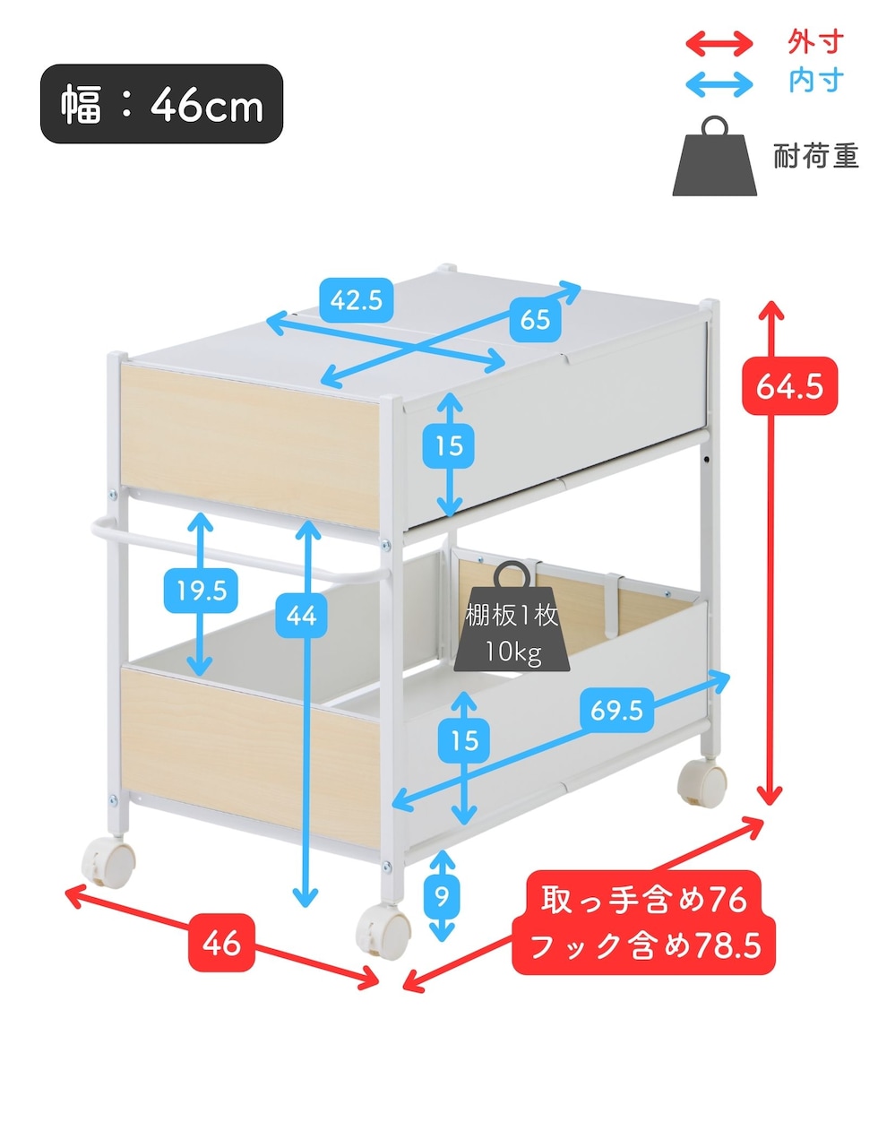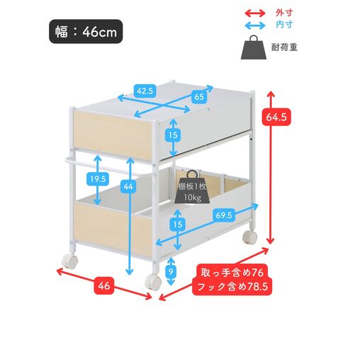 | 本体サイズ | 幅46x奥行76(フック含む78.5)x高さ64.5cm 重量12.5kg |