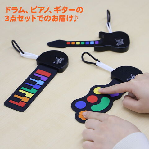 | 商品説明 | ●指で押すだけで演奏できる楽器玩具 ●ドラム・ピアノ・ギターの3点セット ●カラビナ付きなので持ち運びに便利 ●バッグ等に付けても邪魔にならないコンパクトサイズ ●柔らかく安心して遊べるシリコン製 ●ボタン電池CR2032使用 |