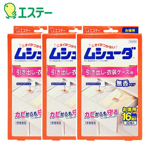 ムシューダ 防虫剤 引き出し・衣装ケース用 無香タイプ お徳用 32個入×3箱 衣類用防虫剤 防カビ剤配合 防虫 防カビ 1年間有効 日本製 引き出し 衣装ケース 箪笥 たんす 衣類収納 衣替え エステー 【送料無料】