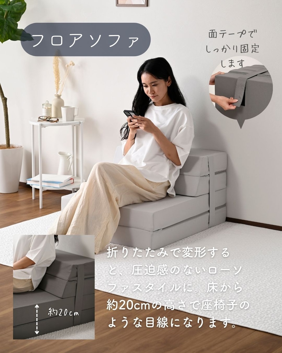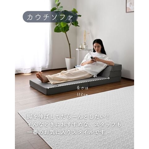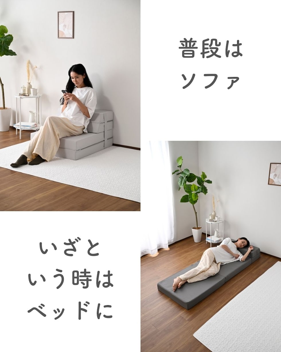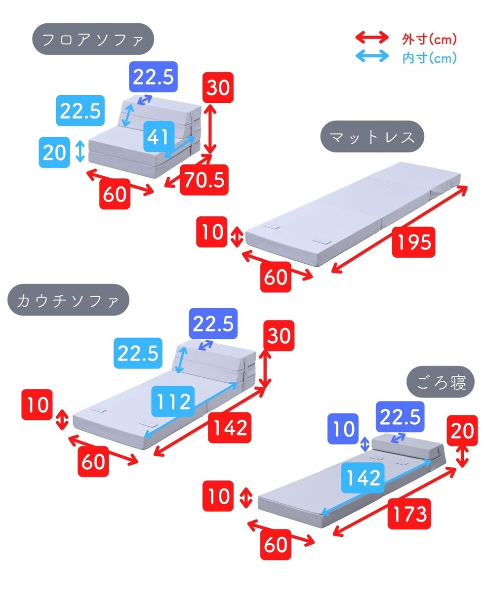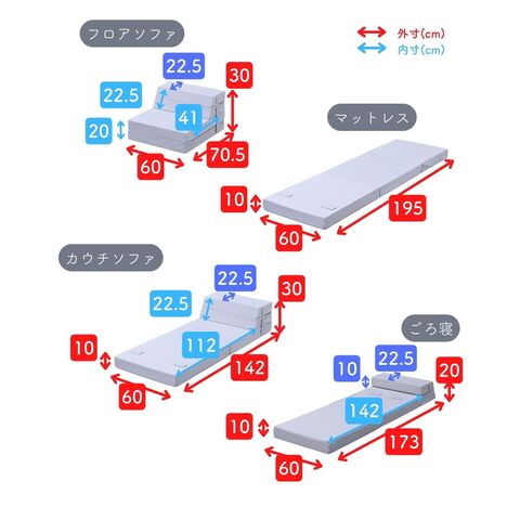| 商品説明 | ●圧縮梱包で玄関先まで小さくお届けできるマットレス ※開封後約1-3日で復元しますが、環境により時間が前後します ●開梱にはハサミが必要 ●マットレス、ソファ、いろんな使い方ができる便利アイテム ●マットレス、ローソファ、座椅子、ごろ寝マット、4通りの使い道 ●ボリュームのある厚み10cmのウレタンフォーム ●JIS基準に準拠する試験を合格した安心仕様 ●寝返りをサポートする、高反発フォームを使用(反発弾性43) ●かたさ200N(ニュートン):【参考】スタッフ所感は、体重40kgの人で沈まずかために感じ、体重80kgの人で沈み込むものの底付きはしない感じです。 ●底付きしにくい密度(28D)で、連続8万回の圧縮試験を経ても復元率は98% ●側地はいざというときに洗濯機で洗濯可能(要ネット使用、内袋はなし) ●ソファ時は面テープのバンドで固定、マットレス時はテープ部をカバーする保護布も同生地でご用意 ●三面ファスナーで出し入れ可能 ●床にキズが入らないように、ファスナーの持ち手はカバーで保護 ●折りたたみ時サイズ: 幅60 奥行70.5 高さ30cm、てっぺん奥行54cm ●ソファ時サイズ: 幅60 奥行70.5 高さ40cm、座面サイズ:幅60 奥行41cm 座面高さ20cm、背もたれ長さ22cm てっぺん22.5cm ●カウチソファ時サイズ: 幅60 長さ142 高さ30cm、座面サイズ:幅60 長さ112cm 座面高さ10cm、背もたれ長さ22cm てっぺん22.5cm ●ごろ寝時サイズ: 幅60 長さ173cm、枕部分高さ20cm、枕部奥行22.5cm、床面長さ142cm ● ※お届けする箱の表記について ★買い物かごの表記と、商品の箱に記載される表示のみ、違いがございます。紛らわしく恐れ入りますが、予めご了承ください。 |