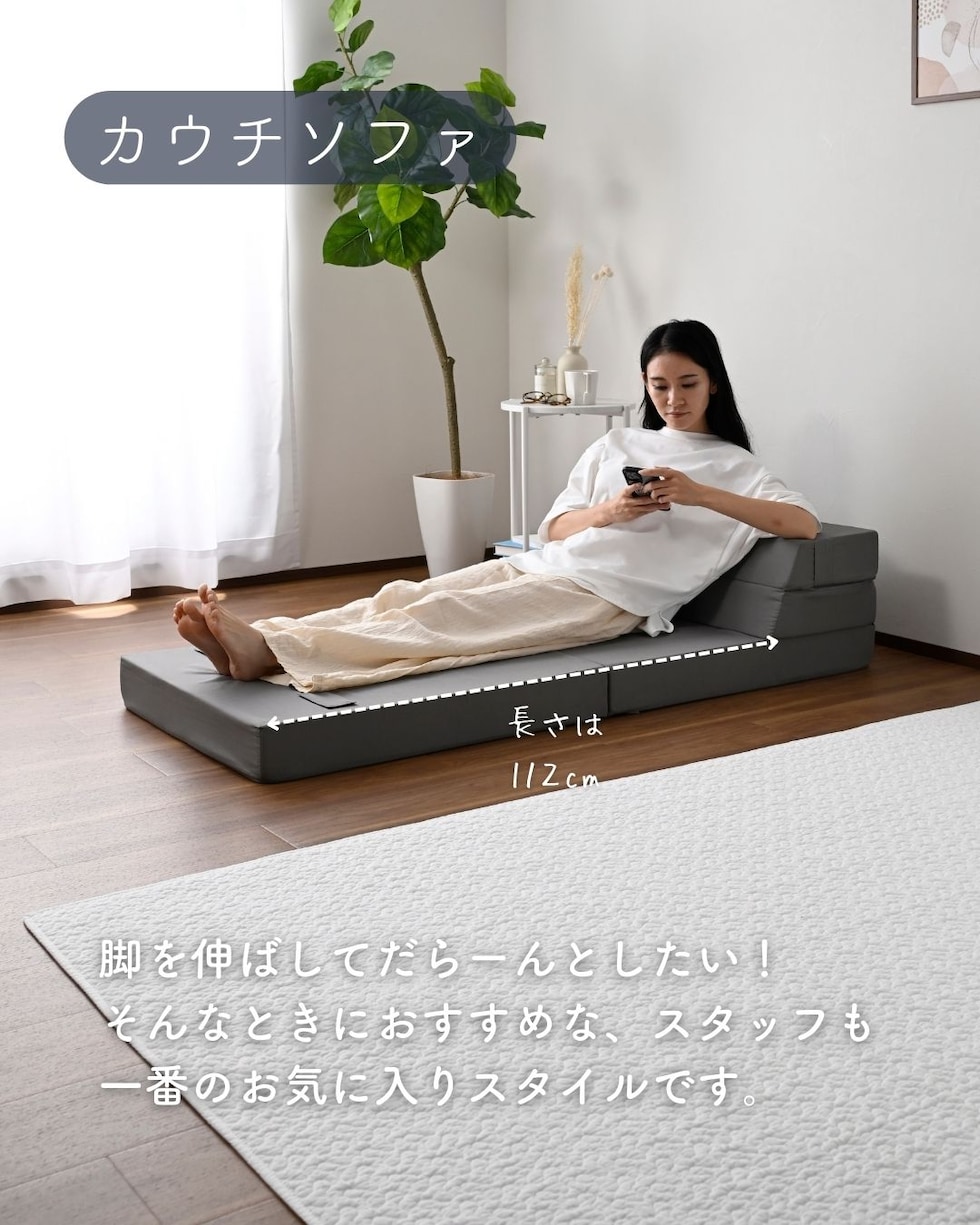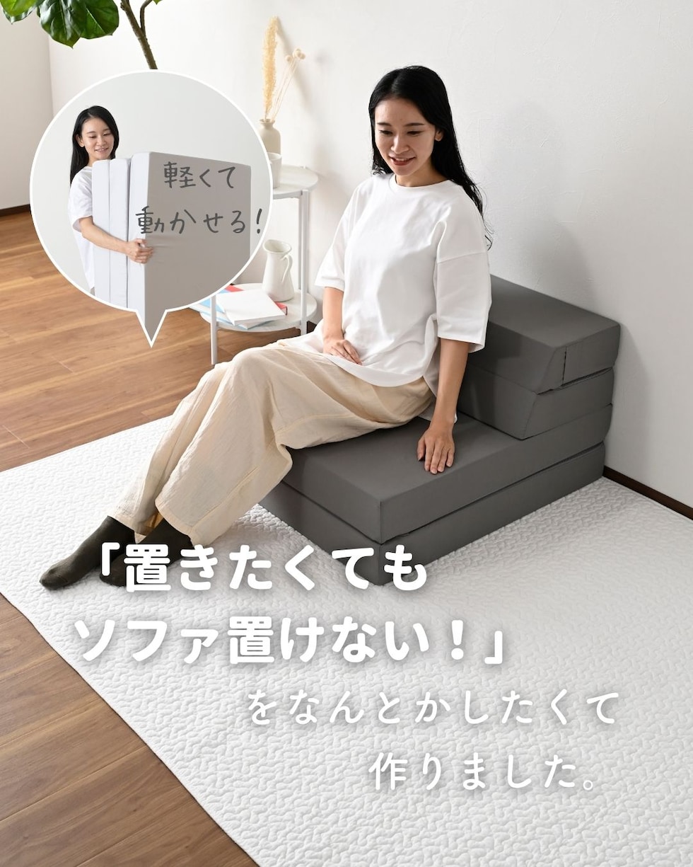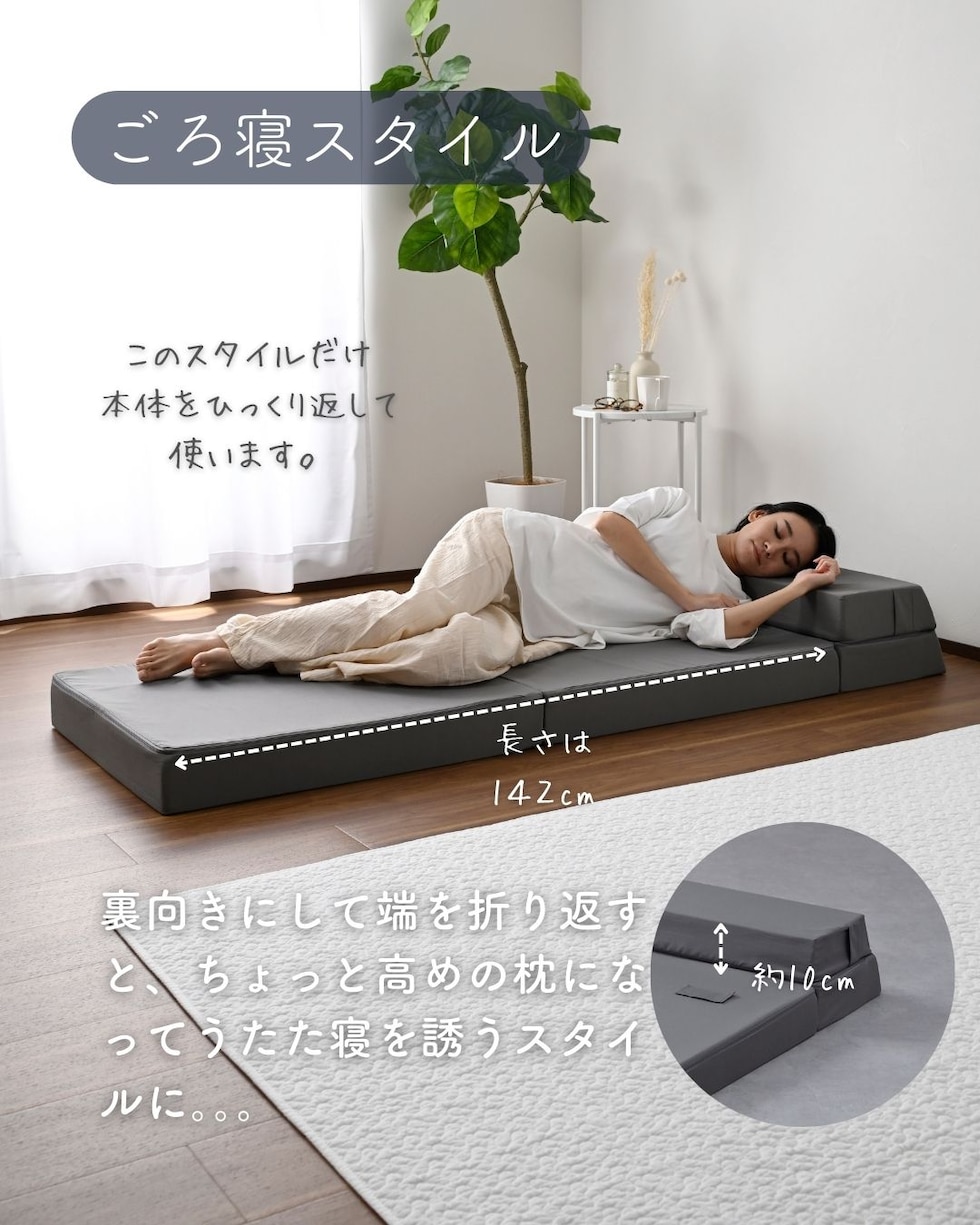 | 商品説明 | ●圧縮梱包で玄関先まで小さくお届けできるマットレス ※開封後約1-3日で復元しますが、環境により時間が前後します ●開梱にはハサミが必要 ●マットレス、ソファ、いろんな使い方ができる便利アイテム ●マットレス、ローソファ、座椅子、ごろ寝マット、4通りの使い道 ●ボリュームのある厚み10cmのウレタンフォーム ●JIS基準に準拠する試験を合格した安心仕様 ●寝返りをサポートする、高反発フォームを使用(反発弾性43) ●かたさ200N(ニュートン):【参考】スタッフ所感は、体重40kgの人で沈まずかために感じ、体重80kgの人で沈み込むものの底付きはしない感じです。 ●底付きしにくい密度(28D)で、連続8万回の圧縮試験を経ても復元率は98% ●側地はいざというときに洗濯機で洗濯可能(要ネット使用、内袋はなし) ●ソファ時は面テープのバンドで固定、マットレス時はテープ部をカバーする保護布も同生地でご用意 ●三面ファスナーで出し入れ可能 ●床にキズが入らないように、ファスナーの持ち手はカバーで保護 ●折りたたみ時サイズ: 幅60 奥行70.5 高さ30cm、てっぺん奥行54cm ●ソファ時サイズ: 幅60 奥行70.5 高さ40cm、座面サイズ:幅60 奥行41cm 座面高さ20cm、背もたれ長さ22cm てっぺん22.5cm ●カウチソファ時サイズ: 幅60 長さ142 高さ30cm、座面サイズ:幅60 長さ112cm 座面高さ10cm、背もたれ長さ22cm てっぺん22.5cm ●ごろ寝時サイズ: 幅60 長さ173cm、枕部分高さ20cm、枕部奥行22.5cm、床面長さ142cm ● ※お届けする箱の表記について ★買い物かごの表記と、商品の箱に記載される表示のみ、違いがございます。紛らわしく恐れ入りますが、予めご了承ください。 |