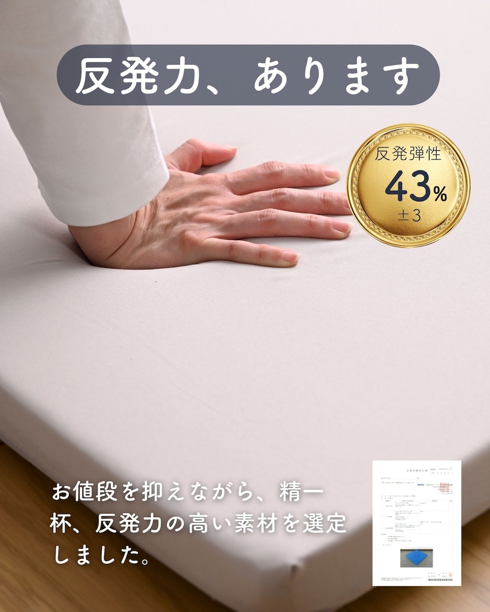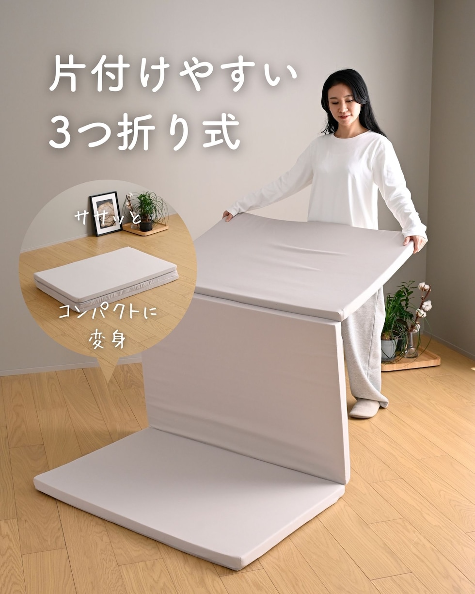 | 商品説明 | ●圧縮梱包で玄関先まで小さくお届けできるマットレス ※開封後2-3日で復元しますが、環境により時間が前後します ●開梱にはハサミが必要 ●折りたたみ時: 長さ65 厚み12cm ●お手持ちの寝具の寝心地を変える、薄いのにかためののウレタンマットレス ●薄くて軽い4cm厚 ●3つ折り式で、コンパクトに収納可能 ●JIS基準に準拠する試験を合格した安心仕様 ●寝返りをサポートする、高反発フォームを使用(反発弾性43) ●かたさ200N(ニュートン):【参考】スタッフ所感は、体重40kgの人で沈み込むものの底付きはしない感じ、体重80kgの人で沈むものぺしゃんこな底付きはない感じです。 ●底付きしにくい密度(28D)で、連続8万回の圧縮試験を経ても復元率は98% ●側地はいざというときに洗濯機で洗濯可能(要ネット使用、内袋はなし) ●三面ファスナーで出し入れ可能 ●床にキズが入らないように、ファスナーの持ち手はカバーで保護 ※お届けする箱の表記について ★買い物かごの表記と、商品の箱に記載される表示のみ、違いがございます。紛らわしく恐れ入りますが、予めご了承ください。 ・グレー→【箱】ダークグレー |