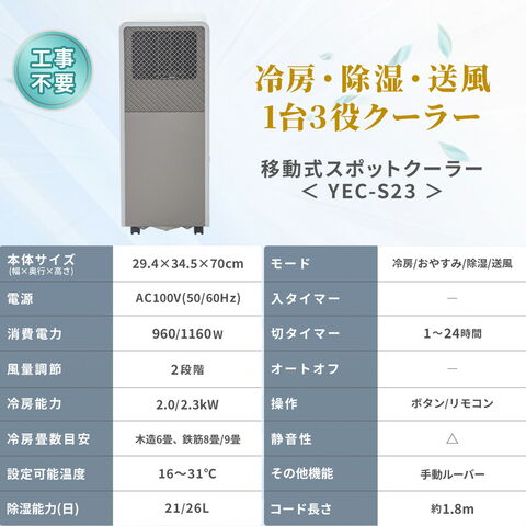 スポットクーラー ポータブルクーラー 工事不要 家庭用 ~9畳 (冷房/除湿/送風) 除湿量26L 風量2段階調節 切タイマー リモコン付き 排熱ダクト付き YEC-S23(W) 移動式エアコン スポットエアコン 家庭用 キャスター シンプル 山善 YAMAZEN 【送料無料】