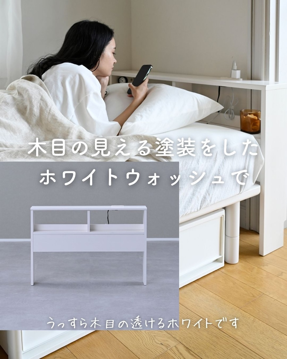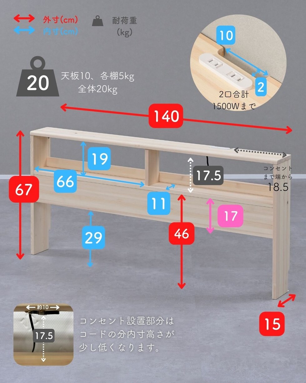 | 商品説明 | ●ドライバー(プラスとマイナス)があると組み立てやすいです。(六角レンチは付属) ●ベッドのヘッドボードにもなる奥行き15cmのスリムなラック ●枕元に棚が欲しい寝室に、後付けできる宮棚 ●従来品を見直して、掃除がしやすくモノが置きやすく変身 ●あたたかみのあるパイン材を使用し、角も安心のR加工でやさしい仕上げ ●棚内部には背面にこぼれ止めを設置 ●従来はオープンだった棚下にも幕板を追加 ●床から収納スペースまでの高さ:46cm ●下棚がなくなって、掃除もしやすいシンプルなつくり ●巾木カット加工で、壁付けしやすい設計 ●2口コンセント付きで、携帯電話の充電も可能 ●コンセントはホコリの侵入を防ぐスライド蓋式 ●コンセントの位置は、正面向かって右手側に配置 ●2口コンセント(合計1500Wまで)、コード長さ約1.8m ●コード孔があるので、棚の内部で充電も可能 ●収納部内寸(※): 【S】幅45 奥行11 高さ19cm 【SD】幅56 奥行11 高さ19cm 【D】幅66 奥行11 高さ19cm 【SSS】幅36 奥行11 高さ19cm ※コンセントのコードがあるため、一部棚の内寸高さが17.5cmほどの箇所がございます。 |