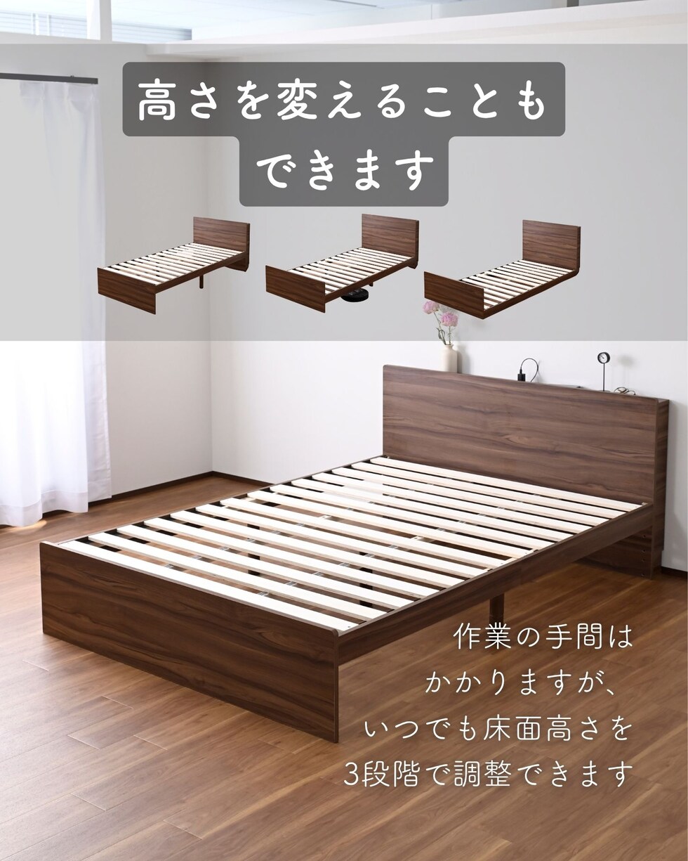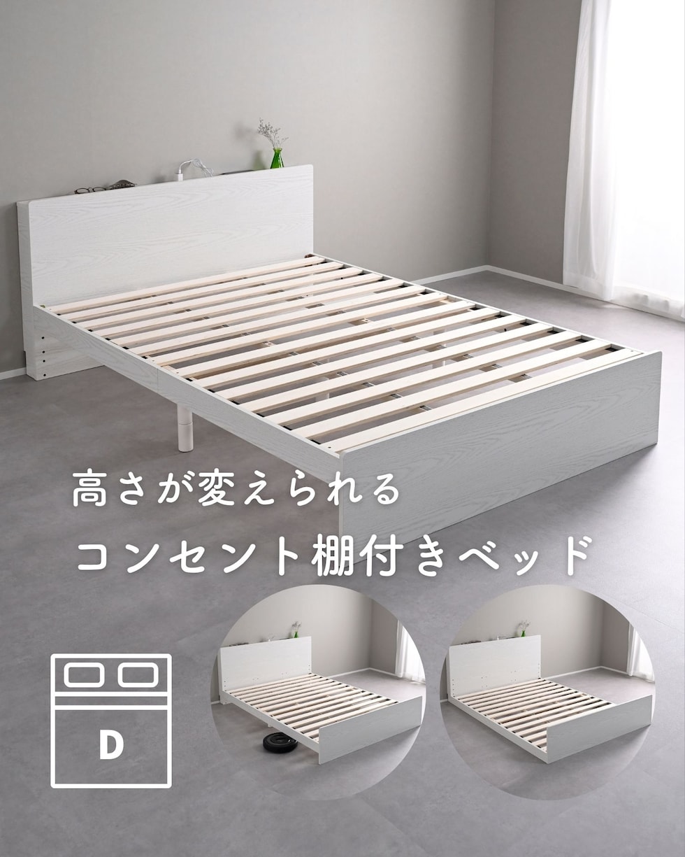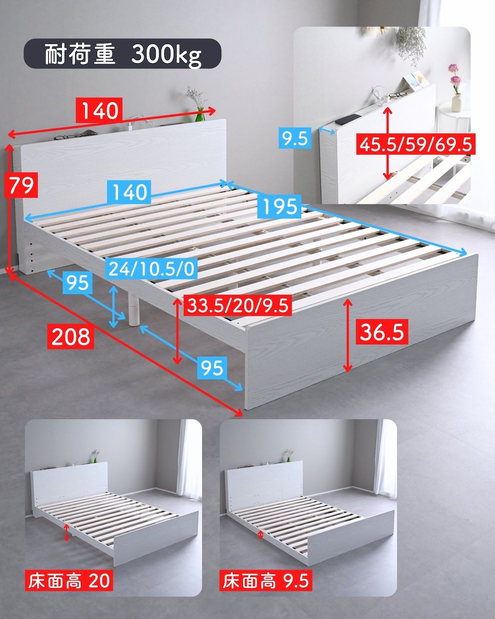 | 商品説明 | ●ベッドフレームは2梱包で重たい荷姿で玄関先までのお届けとなります。搬入、組み立て、設置はお二人以上での作業がおすすめです。 ●プラスドライバーをご用意ください。(六角レンチは付属あり) ●高さもゆったり、薄型の棚付きベッドフレーム ●ベッドは床面高さを3段階に調節可能 ※ヘッドボードは必ず壁付けして設置してください。 ●棚には2口コンセントが付いていて、枕元でスマホの充電が可能 ●棚は手前がこぼれ止めになっているので、壁に立てかければスタンドとしても活躍 ●棚内寸: 奥行9.5cm (中央に11×2cmのコンセントあり) ●こぼれ止め立ち上がり: 2cm ●2口コンセント、合計1500Wまで、コード長さ1.7m ●コンセントは棚のほぼ中央に配置 ●ホコリガードのフタ付きコンセント ●床面の高さは3段階で変更可能 ●【床面高さ33.5cm時】ベッド下には衣装ケースも置いて収納スペースとしても活躍 ●【床面高さ20cm時】ロボット掃除機も入ってベッド下の掃除もしやすい、ローベッド ●【床面高さ9.5cm時】ほぼ床寝スタイルのフロアベッド ●床面は厚み15mmのある積層材すのこを、補強フレームで支える、きしみも少ない頑丈設計 ●すのこ隙間: 約6.5cm(中央8.5)cm、7枚×2組で合計14枚すのこ ●フレームやヘッドボードには、湿気や傷に強い、メラミン樹脂化粧の素材を使用 ●脚部裏に貼り付けるフェルトシール付属 ●静止耐荷重: 200kg ※本製品は最大荷重試験の7000N(約700Kg)をクリアした商品です。当社では安全を考慮し、本商品はシングルベッド利用時は耐荷重200Kgに設定しております。耐荷重は保証値ではございません。 ●床面高さ: 33.5/20/9.5cm ●床からフットボード高さ36.5 ●床からヘッドボード高さ79、宮棚までの高さ77cm ●床面からヘッドボードまでの高さ:45.5/59/69.5cm ●床面サイズ: 幅140 長さ195cm ●ベッド下: 高さ24/10.5/0cm、幅95cm |
