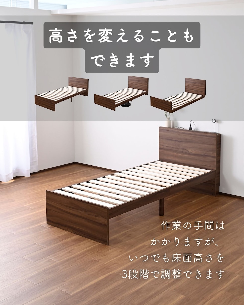 | 商品説明 | ●ベッドフレームは2梱包で重たい荷姿で玄関先までのお届けとなります。搬入、組み立て、設置はお二人以上での作業がおすすめです。 ●プラスドライバーをご用意ください。(六角レンチは付属あり) ●高さもゆったり、薄型の棚付きベッドフレーム ●ベッドは床面高さを3段階に調節可能 ※ヘッドボードは必ず壁付けして設置してください。 ●棚には2口コンセントが付いていて、枕元でスマホの充電が可能 ●棚は手前がこぼれ止めになっているので、壁に立てかければスタンドとしても活躍 ●棚内寸: 奥行9.5cm (中央に11×2cmのコンセントあり) ●こぼれ止め立ち上がり: 2cm ●2口コンセント、合計1500Wまで、コード長さ1.7m ●コンセントは棚のほぼ中央に配置 ●ホコリガードのフタ付きコンセント ●床面の高さは3段階で変更可能 ●【床面高さ33.5cm時】ベッド下には衣装ケースも置いて収納スペースとしても活躍 ●【床面高さ20cm時】ロボット掃除機も入ってベッド下の掃除もしやすい、ローベッド ●【床面高さ9.5cm時】ほぼ床寝スタイルのフロアベッド ●床面は厚み15mmのある積層材すのこを、補強フレームで支える、きしみも少ない頑丈設計 ●すのこ隙間: 約6.5cm(中央8.5)cm、7枚×2組で合計14枚すのこ ●フレームやヘッドボードには、湿気や傷に強い、メラミン樹脂化粧の素材を使用 ●脚部裏に貼り付けるフェルトシール付属 ●静止耐荷重: 200kg ※本製品は最大荷重試験の7000N(約700Kg)をクリアした商品です。当社では安全を考慮し、本商品はシングルベッド利用時は耐荷重200Kgに設定しております。耐荷重は保証値ではございません。 ●床面高さ: 33.5/20/9.5cm ●床からフットボード高さ36.5 ●床からヘッドボード高さ79、宮棚までの高さ77cm ●床面からヘッドボードまでの高さ:45.5/59/69.5cm ●床面サイズ: 幅80 長さ180cm ●ベッド下: 高さ24/10.5/0cm、幅87.5cm |