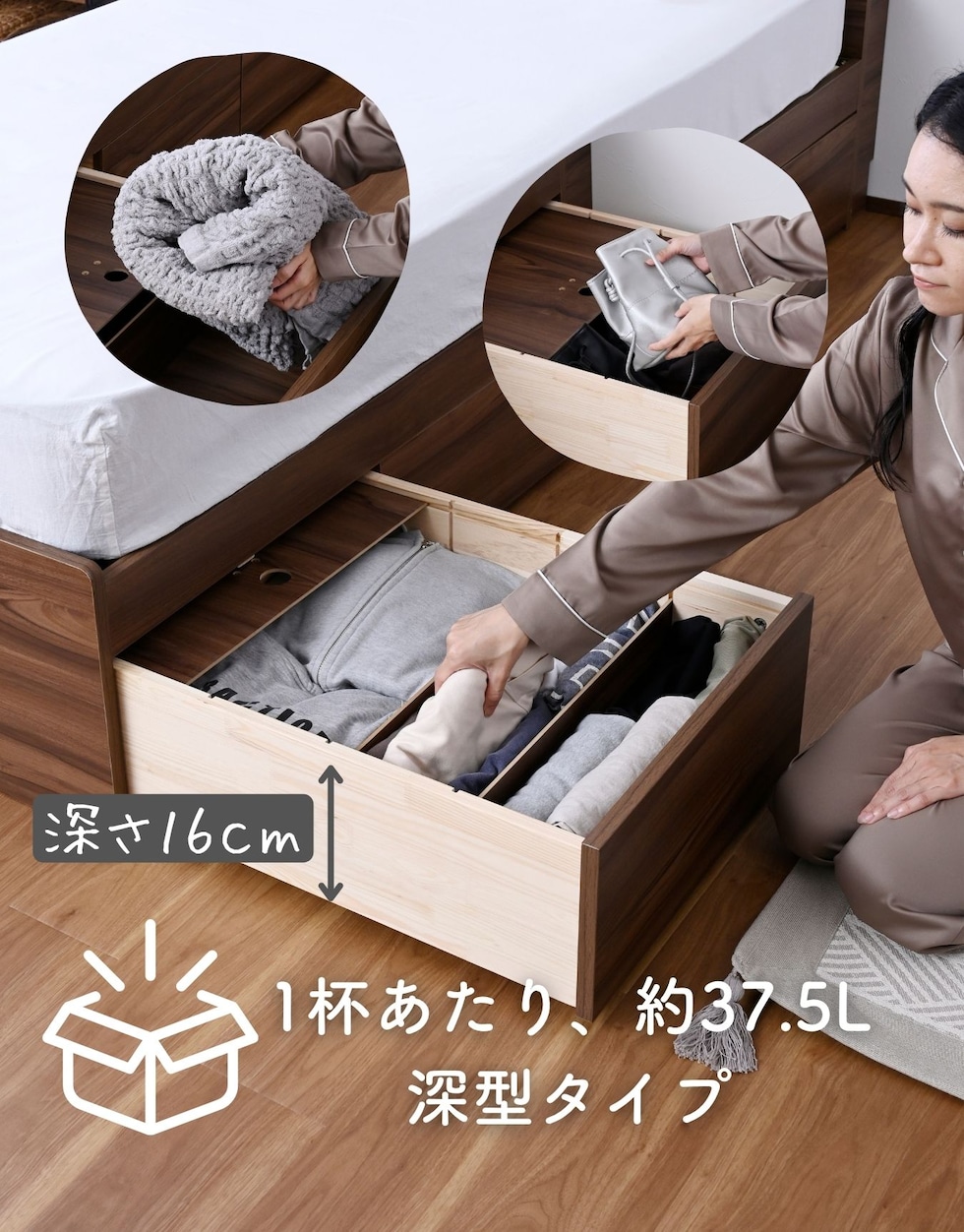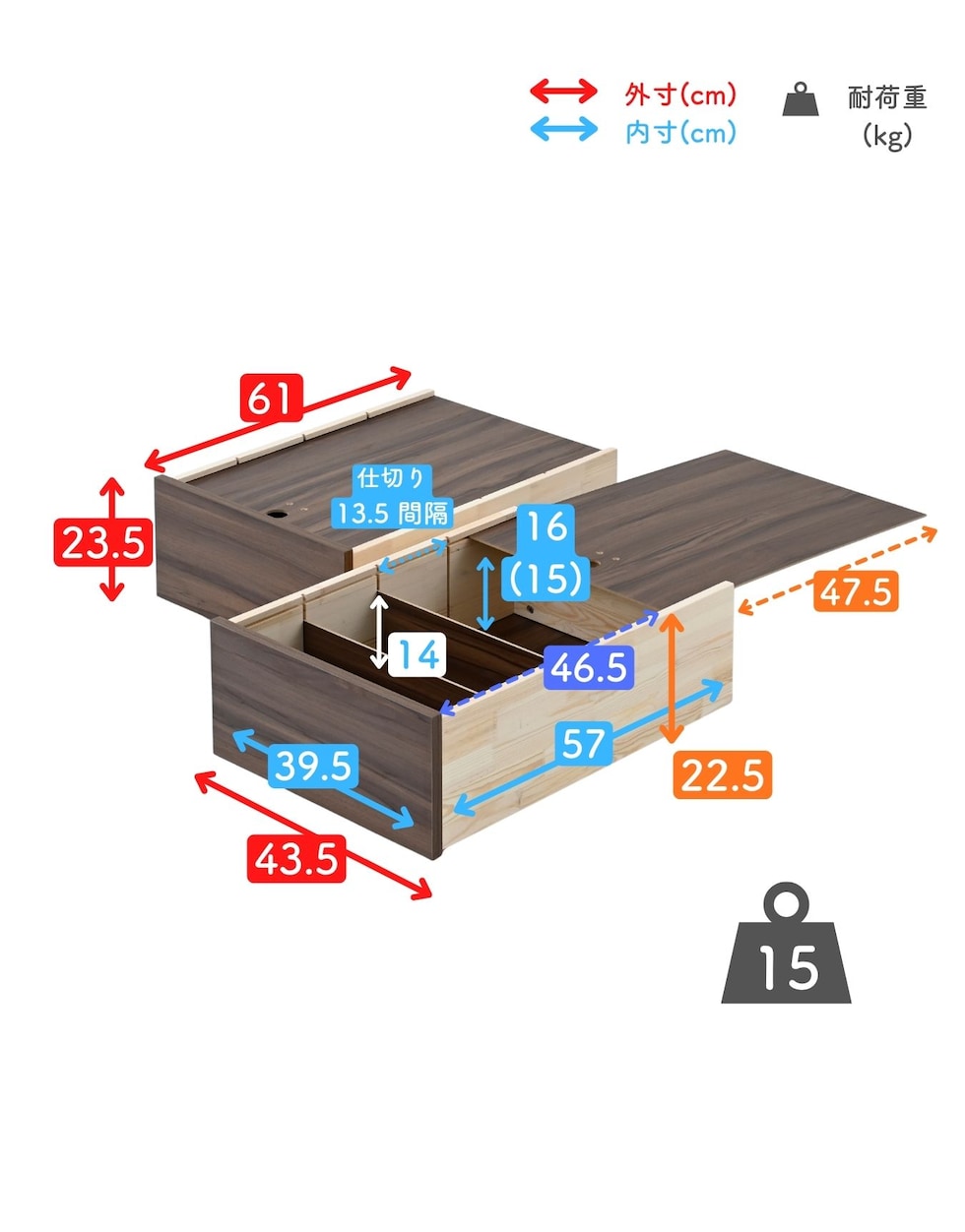 | 商品説明 | ●ベッド下を活用する、キャスター付き収納ボックス ●ベッドの幅を活用する、幅狭・奥深タイプ ●容量目安: 1杯あたり約37.5リットル ●奥深を活かせるよう、着脱式の仕切り付き ●仕切りを外せば大きなモノも収納可能 ●ホコリを防ぐ、スライド式のフタ付き(取っ手用の穴はあり) ●フタにはストッパーも付いて、抜け落ち防止 ●前後方向に動くキャスター付きで出し入れサポート (ベッド下に入り込まないように、別売りのベッド側にはストッパーも配備) ●裏面には補強桟も入ったしっかり構造 ●耐荷重15kg ●前板下側に隙間があって取っ手になっているので、前板の見た目すっきり ●引き出し内寸:幅39.5 奥行57 深さ15cm ●間口奥行: 46.5cm ●仕切り: 高さ14cm、13.5cm間隔で3カ所配置可能 ●取っ手径: 3.5cm ●1個につき、キャスター4個 (ストッパーなし・直線可動) |